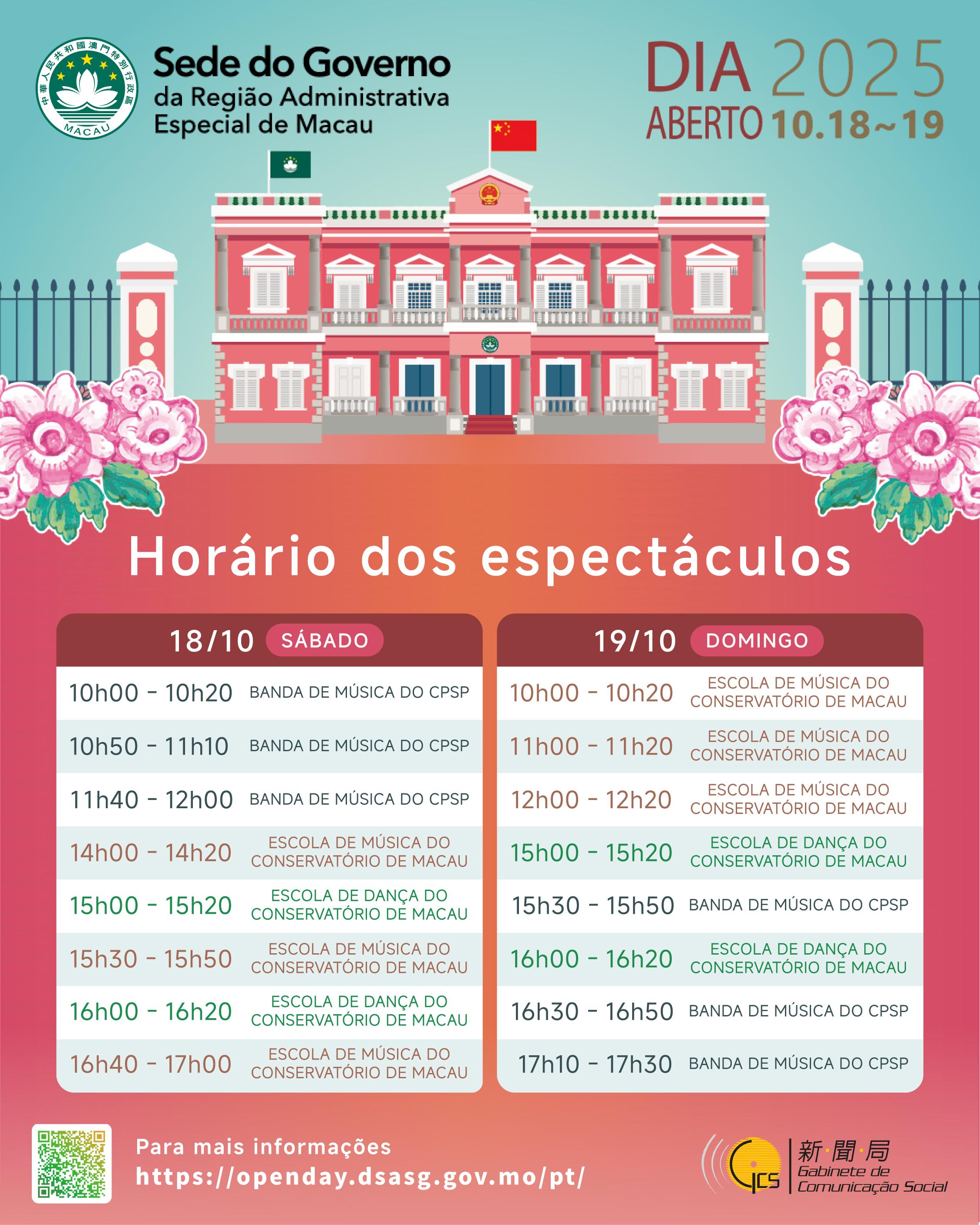 A população pode ainda assistir a uma série de espectáculos, nomeadamente, da Banda da PSP e dos alunos da Escola de Música e Escola de Dança do Conservatório de Macau. A Direcção dos Serviços de Correios e Telecomunicações também terá disponível um posto temporário, no lado oposto à Sede do Governo, no lago Nam Van, onde se poderá pôr o carimbo comemorativo, comprar os produtos filatélicos, no âmbito do dia da abertura da Sede do Governo.