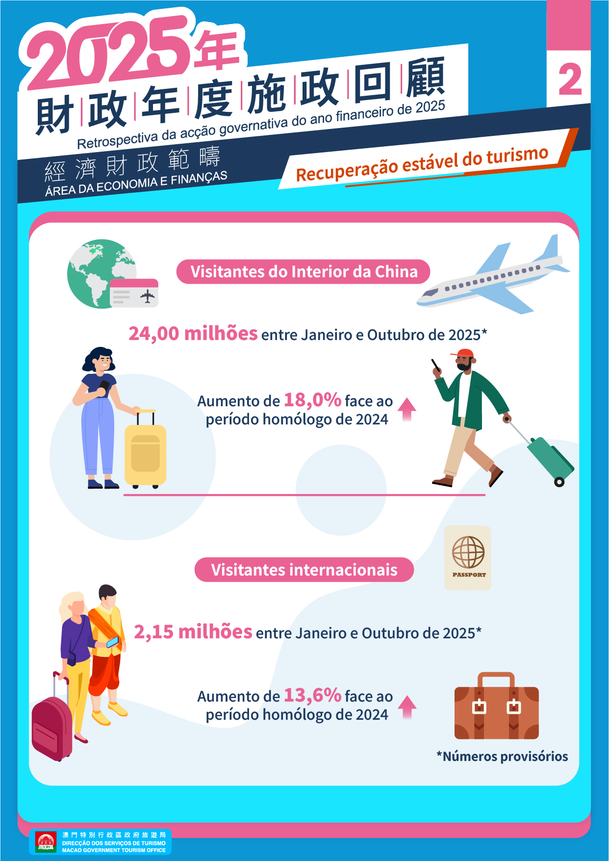 De acordo com números preliminares, entre Janeiro e Outubro de 2025 Macau recebeu um total de 33 milhões de visitantes, um aumento homólogo de 14,1%, retomando em 99,3% os valores registados no mesmo período de 2019. O número de visitantes internacionais continuou a crescer, tendo atingido 2,15 milhões, num aumento de 13,6% em termos homólogos. Durante a “semana dourada” do Dia Nacional, o número médio de visitantes foi de 143 mil por dia, tendo atingido 191 mil no dia 4 de Outubro, um novo recorde durante os feriados do Dia Nacional. A taxa de ocupação média dos hotéis e similares no período de Janeiro a Setembro deste ano foi de 89,3%, mais 3,9 pontos percentuais, face ao mesmo período do ano passado.