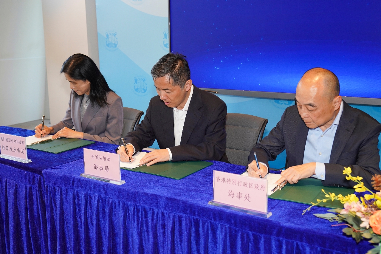 Com vista a garantir a segurança do tráfego marítimo na Grande Baía, a Administração de Segurança Marítima do Ministério dos Transportes, o Departamento Marítimo de Hong Kong e a Direcção dos Serviços de Assuntos Marítimos e de Água de Macau realizaram hoje (dia 14) em Macau a “Reunião de Cooperação Marítima entre o Interior da China, Hong Kong e Macau” e a “Reunião de Trabalho de Segurança Marítima entre Hong Kong e Macau”, e foi também realizada a cerimónia de assinatura do “Acordo de Cooperação sobre partilha e gestão conjunta das informações sobre segurança do tráfego marítimo entre o Interior da China, Hong Kong e Macau”, no sentido de reforçar a comunicação mútua de informações sobre segurança do tráfego marítimo, elevar a eficácia da gestão marítima e desenvolver um sistema de segurança marítima de melhor qualidade para a Grande Baía.
