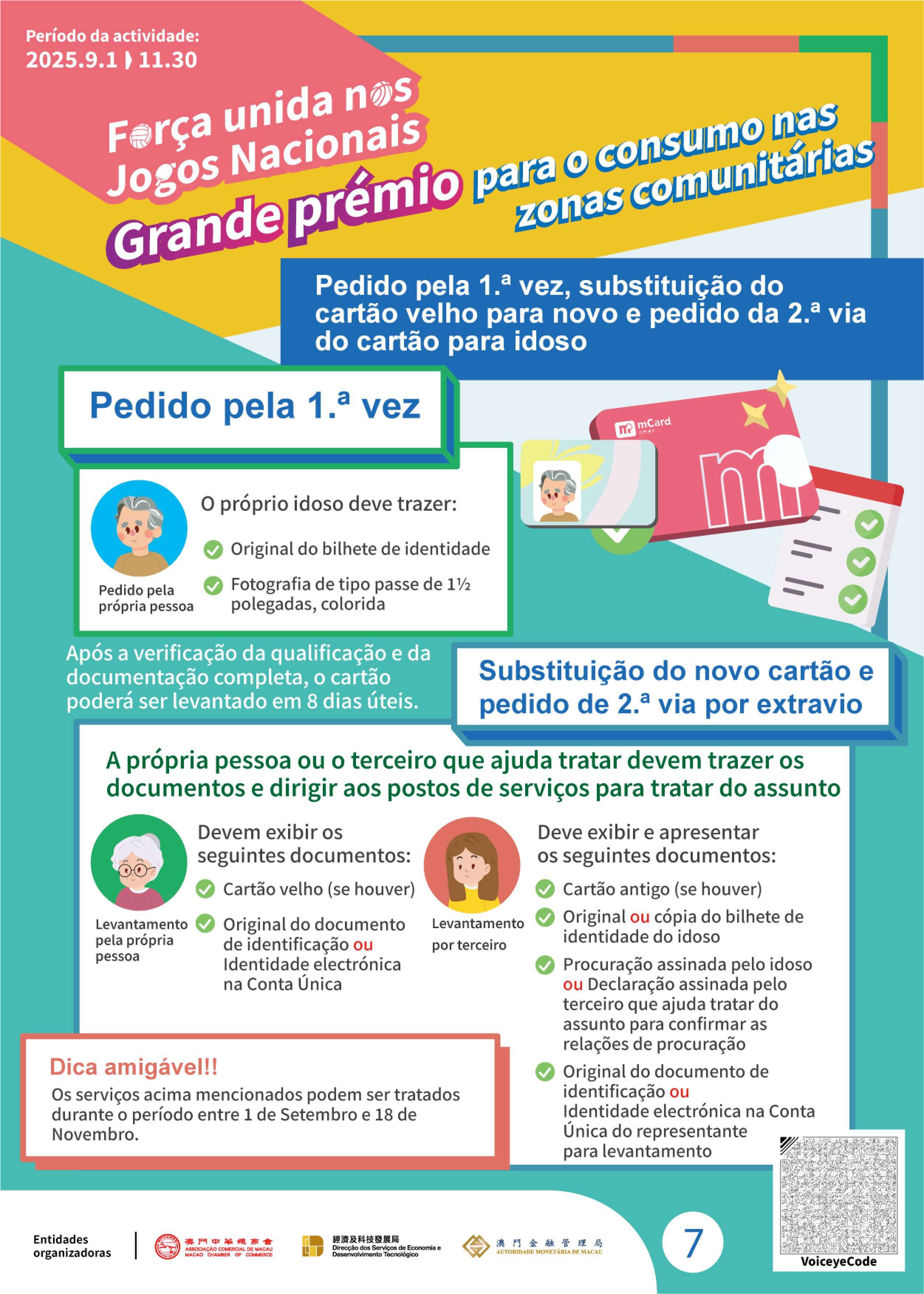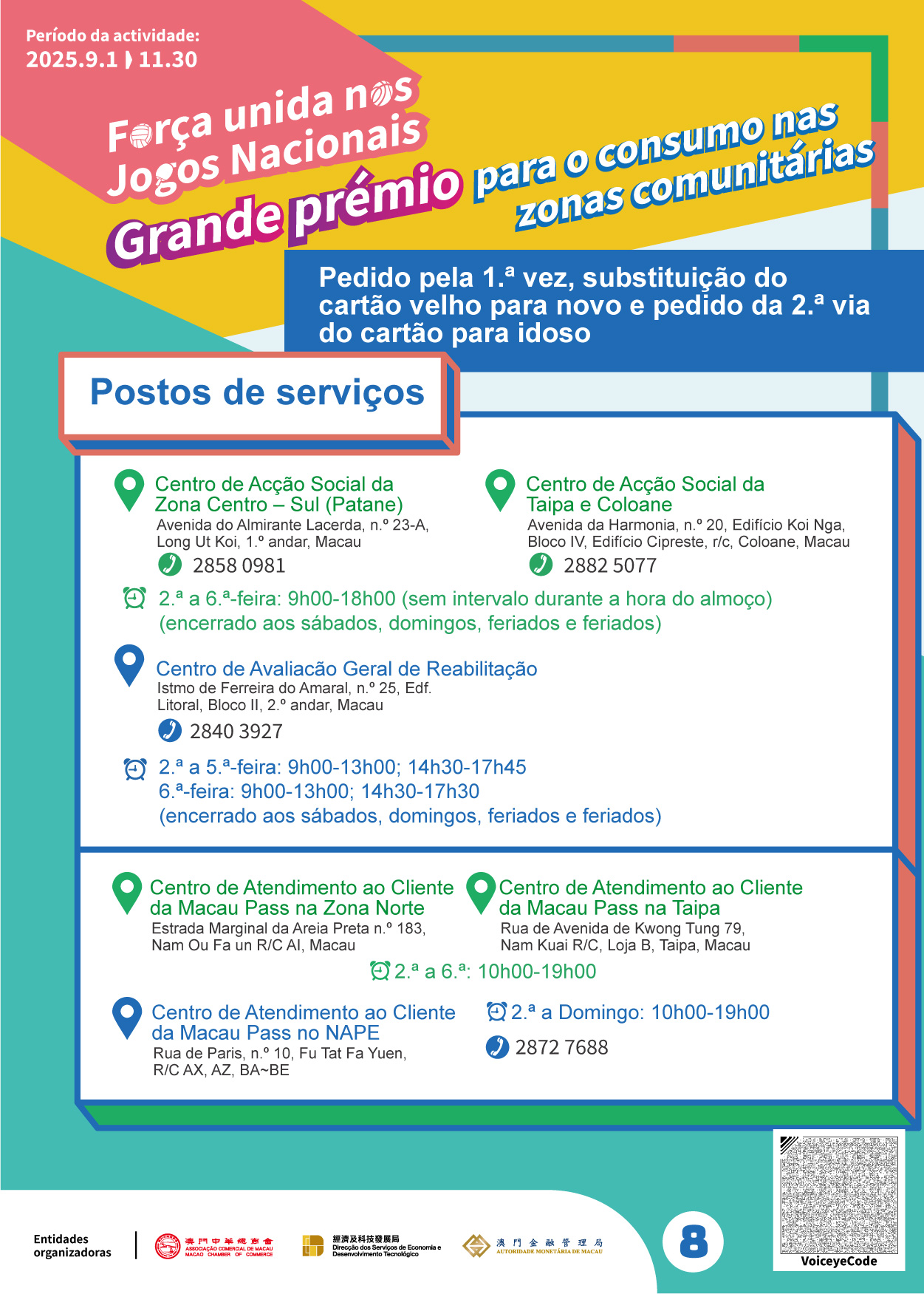 Todos os idosos que completem 65 anos de idade até 28 de Novembro podem, durante o período da actividade, deslocar-se a mais de 100 postos de serviço designados em Macau para obter os benefícios de desconto imediato no valor de 500 patacas mediante carregamento do seu Cartão Macau Pass para Idosos. Amanhã (dia 18) é o último dia para serviços de pedido pela primeira emissão, substituição do cartão velho para novo e pedido da 2.ª via do cartão para idoso. Os idosos que tenham necessidade podem dirigir-se, durante os dias de funcionamento, a qualquer um dos três centros de serviços da Macau Pass, Centro de Acção Social da Zona Centro – Sul (Patane), Centro da Acção Socail da Taipa e Coloane e Centro de Avaliação Geral de Reabilitação.