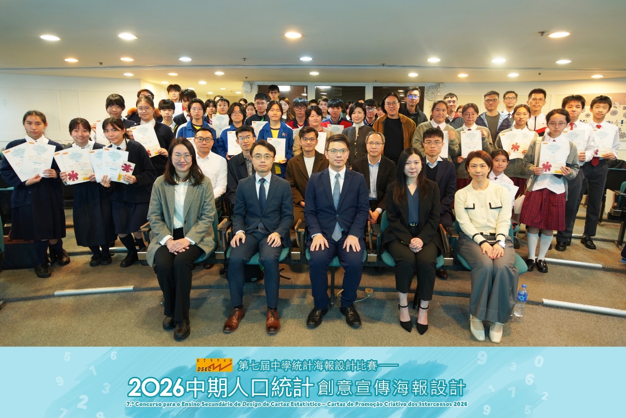 A Direcção dos Serviços de Estatística e Censos (DSEC) realizou o “7.º Concurso para o Ensino Secundário de Design de Cartaz Estatístico – Cartaz de Promoção Criativo dos Intercensos 2026”, com o objectivo de elevar o interesse dos estudantes do ensino secundário nas estatísticas e de promover a realização da operação estatística denominada Intercensos no próximo ano. A cerimónia de entrega de prémios do concurso teve lugar recentemente (dia 14) no Fashion Lab do Centro de Produtividade e de Transferência de Tecnologia, tendo sido atribuídos 18 prémios (1.º, 2.º, 3.º e 4.º classificados, prémios de distinção e prémios de “Maior Popularidade na Internet”).