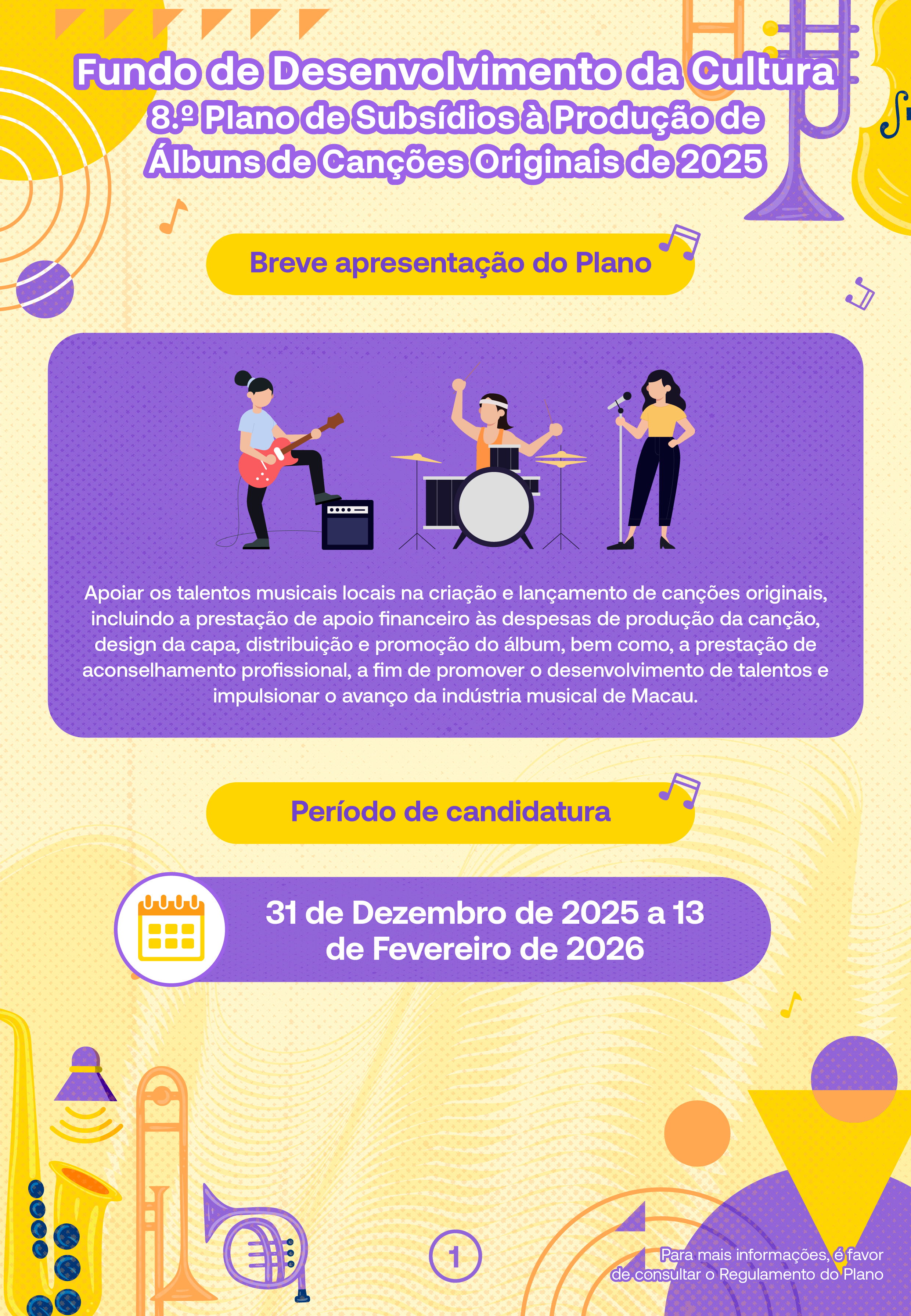 O período de candidatura decorrerá de 31 de Dezembro de 2025 a 13 de Fevereiro de 2026. Os álbuns a subsidiar são de dois tipos, nomeadamente, “miniálbuns” e “álbuns”, excluindo as colectâneas musicais e os álbuns de grandes êxitos. Todas as canções devem ser obras originais, inéditas e não encomendadas, com um mínimo de 3 canções para “miniálbuns” e um mínimo de 6 canções para “álbuns”. Os álbuns financiados devem ser distribuídos digitalmente em pelo menos 4 plataformas comerciais de música digital, pelo menos uma das quais deve ser plataforma relevante do Interior da China, devendo os intérpretes participar em pelo menos um evento público offline e interpretar pelo menos uma canção do álbum financiado. Cada candidatura deve incluir apenas a produção de um miniálbum ou de um álbum.