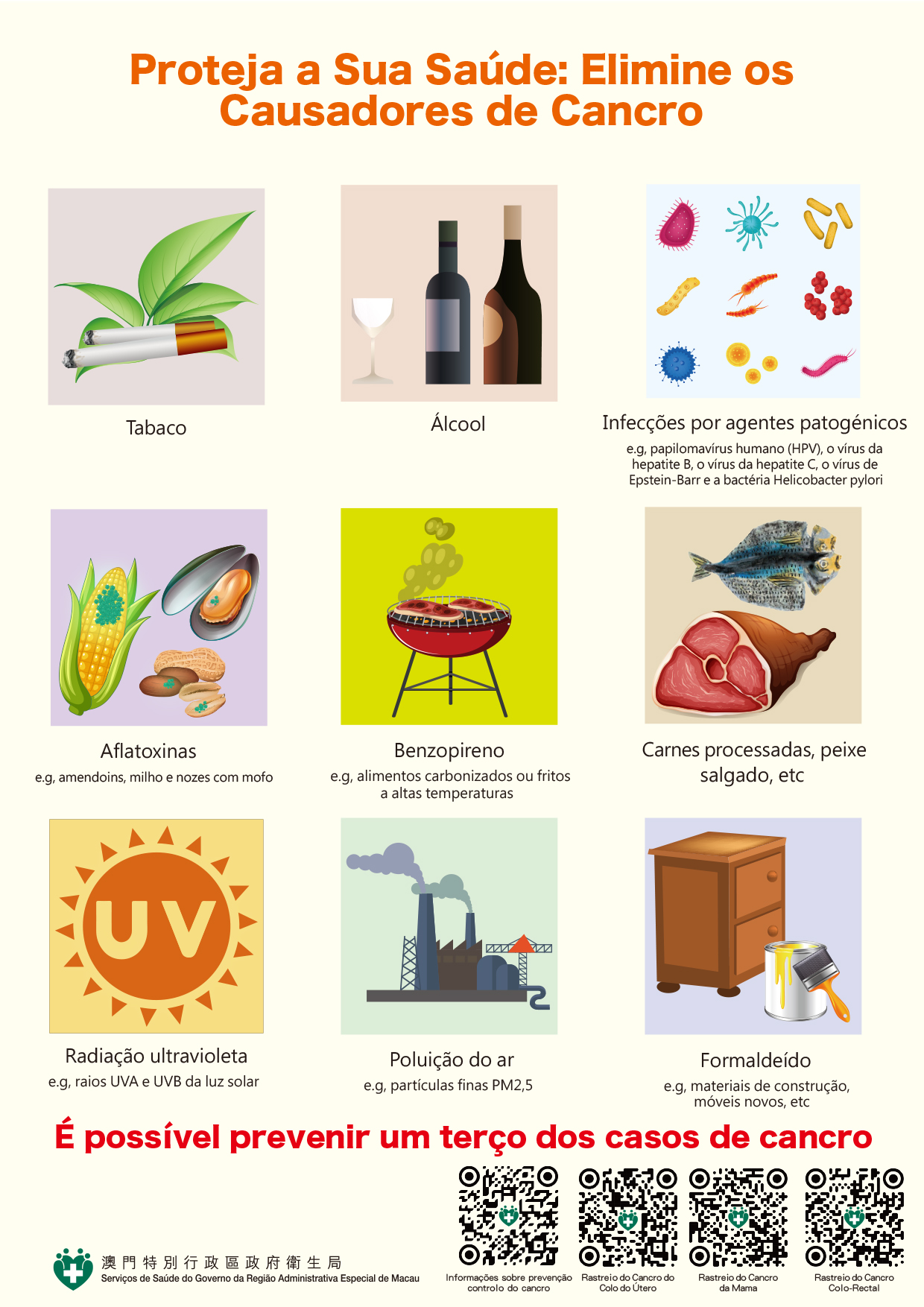 Os Serviços de Saúde sensibilizam os residentes para que as acções contra o cancro sejam integradas na vida quotidiana e que tomem a iniciativa de prestar atenção aos sinais relacionados com o cancro que podem surgir no corpo, tais como tosse persistente de causa desconhecida, voz rouca, febre, perda de peso ou alterações nos hábitos intestinais. Ao mesmo tempo, deve afastar-se dos carcinógenos comuns, incluindo tabaco, álcool, alimentos mofados, alimentos queimados, carne processada (como salsichas, bacon, fiambre, peixe salgado) e a exposição excessiva a raios ultravioletas. Além disso, propõe-se que, de acordo com as orientações dos Serviços de Saúde, se submetam periodicamente ao rastreio do cancro do colo do útero, do cancro da mama e do rastreio do cancro colorrectal, com vista à prevenção, detecção e diagnóstico precoces.