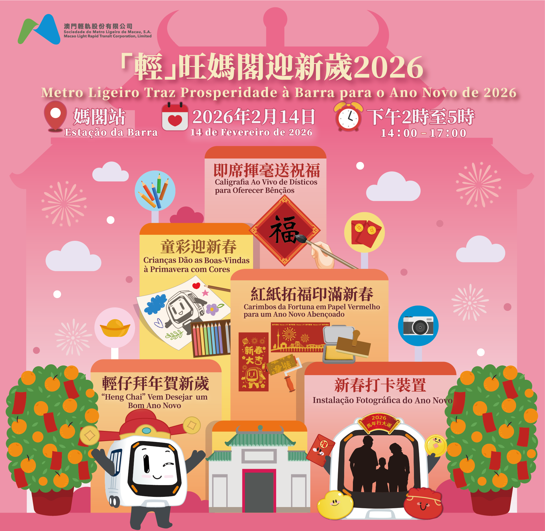 A Sociedade do Metro Ligeiro de Macau, S.A. (doravante designada por “MLM”) vai lançar a série especial de actividades “Metro Ligeiro Traz Prosperidade para o Ano Novo de 2026” para celebrar o Ano Novo Chinês com os residentes e turistas , incluindo o lançamento inédito de comboios decorados com as cores da festividade e um evento público na Estação da Barra, a 14 de Fevereiro, que contará com experiências interactivas.