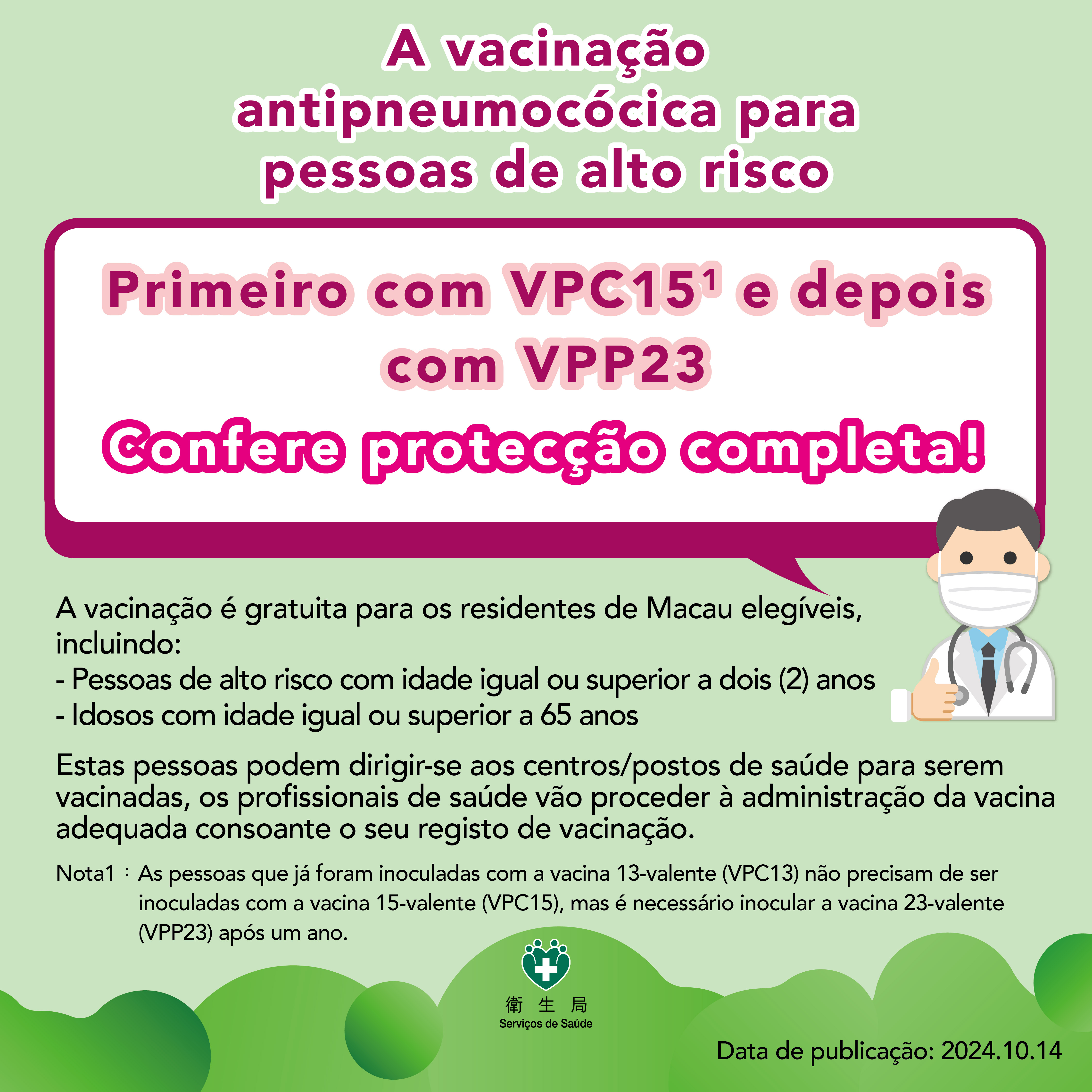 Os indivíduos com elevado risco de saúde, tais como idosos, pacientes com doenças crónicas ou pessoas com um sistema imunitário debilitado, apresentam um risco significativamente superior de desenvolver sintomas graves ou fatalidades em caso de infecção pelo novo tipo de coronavírus, quando comparados com indivíduos não vulneráveis. Desta forma, recomenda-se a administração da vacina LP.8.1. Adicionalmente, recomenda-se às pessoas de alto risco previamente mencionadas que lhes seja administrada uma dose de vacina pneumocócica conjugada 15-valente (VPC15) e que lhes seja administrada, no prazo de um ano, uma dose adicional de vacina pneumocócica polissacárida 23-valente (PPSV23), com o objectivo de prevenir doenças fatais de pneumocócica invasiva. Em caso de administração prévia da vacina pneumocócica 13-valente (VPC13), a administração da VPC15 não se revela necessária. A administração da vacina pneumocócica e da vacina contra a COVID-19 pode ocorrer em simultâneo ou em momentos distintos. Para informações mais pormenorizadas, o indivíduo pode consultar os profissionais de saúde de postos de vacinação, a fim de programar a vacinação adequada.