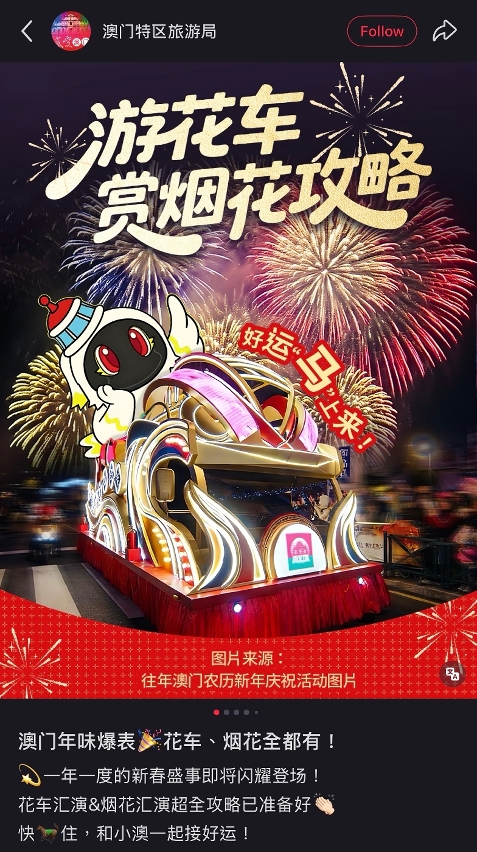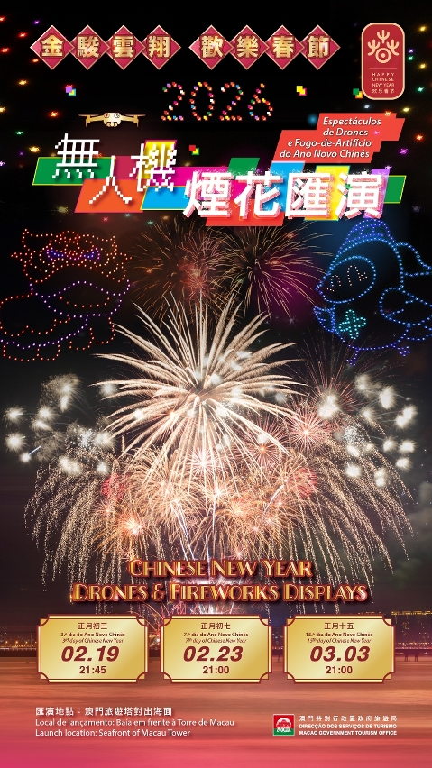 A DST organizará três eventos de grande envergadura para o Ano Novo Chinês, integradas no quadro de actividades “Feliz Ano Novo Chinês” do Ministério da Cultura e Turismo da República Popular da China, incluindo as “Actividades do Ano Novo Chinês 2026”, “Parada de Celebração do Ano do Cavalo” e “2026 Espectáculos de Drones e Fogo-de-Artifício”, que celebrarão as festividades, em conjunto com os residentes e visitantes, e exibirão a atracção do “turismo + eventos” de Macau.