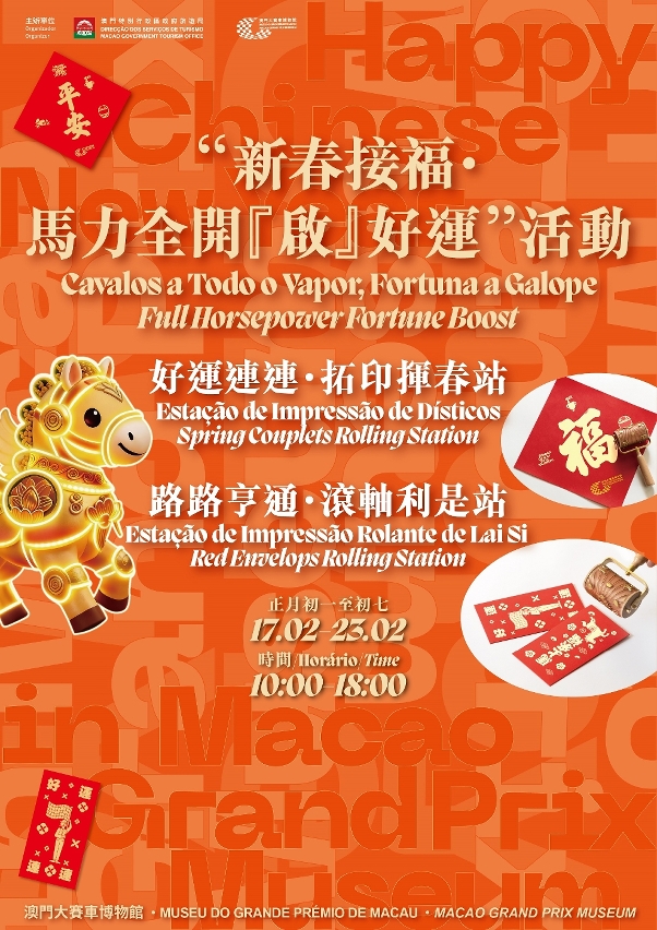 O Museu do Grande Prémio de Macau, sob a alçada da DST, irá realizar nos dias 17 a 23 de Fevereiro a actividade “Cavalos a Todo o Vapor, Fortuna a Galope”, na qual os visitantes poderão produzir dísticos alusivos ao Ano Novo Chinês e envelopes de lai si. A loja de lembranças do MGPM apresenta, até 31 de Março, promoções do Ano Novo Chinês e do Festival das Lanternas, conjuntos de lembranças com descontos, oferecendo ainda desconto de 30% na venda de alguns produtos.