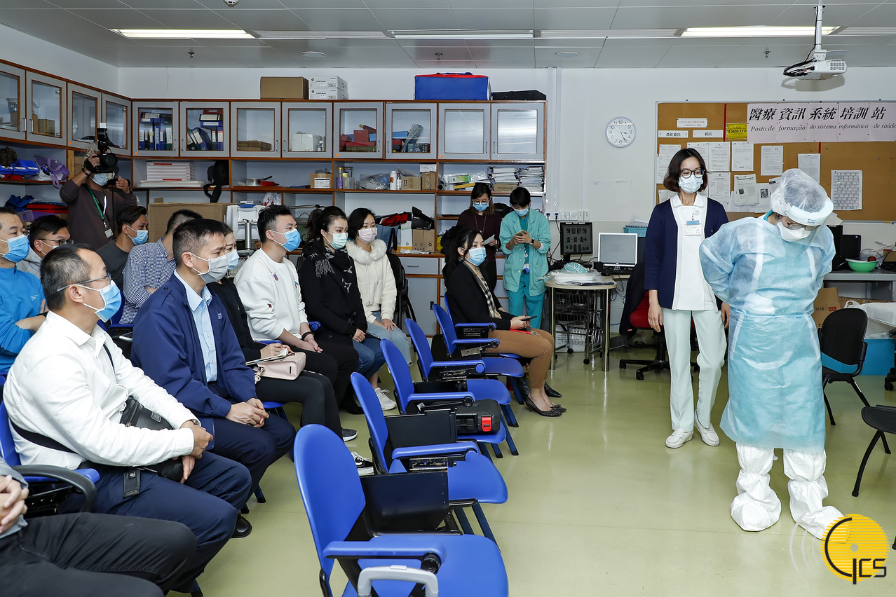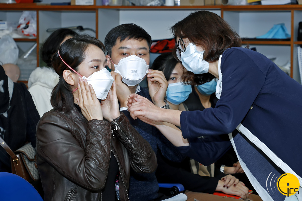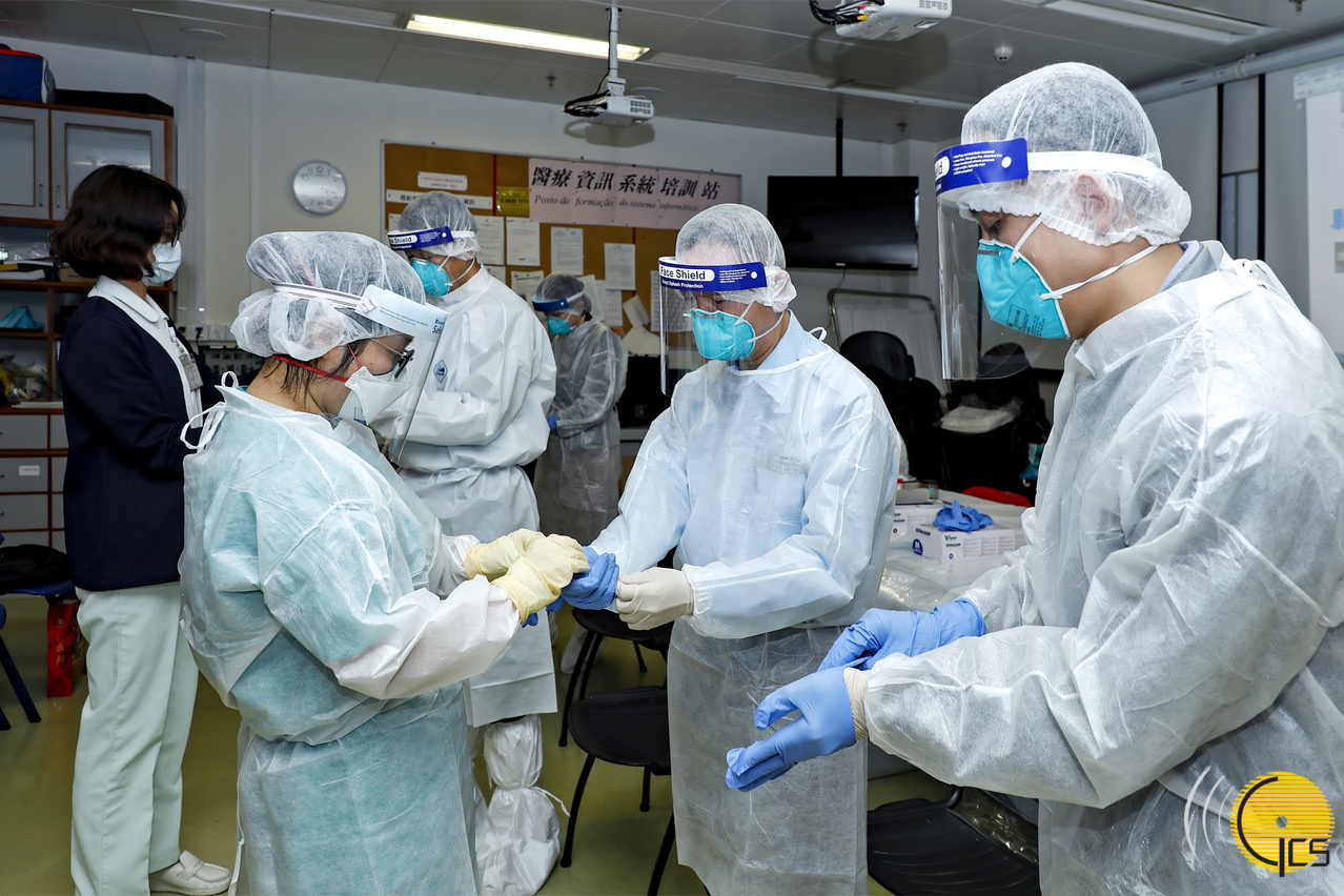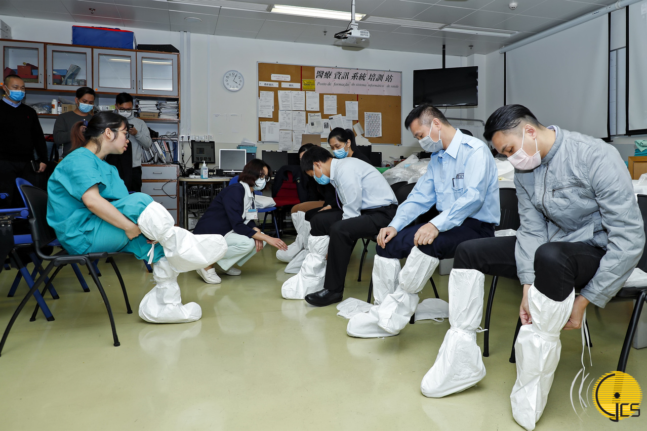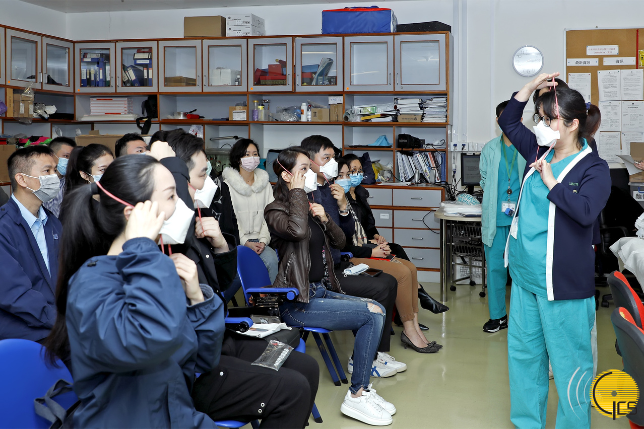 医护人员教导机场地勤及赴湖北随机工作人员穿着防护衣及配戴口罩等准备工作。