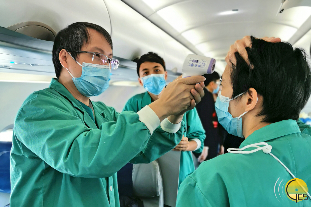 工作人员抵达湖北前,在机上测量体温。