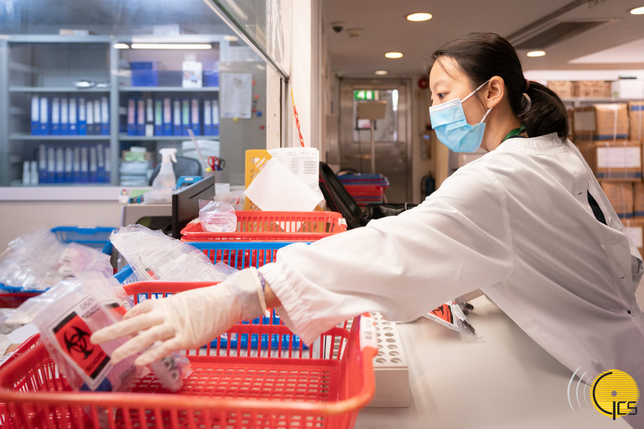 工作人员正核对样本资料、标贴样本编号。化验所负责及协助核酸检测的工作人员约30人。针对核酸检测已将办公时间调整至早上8时到晚上10时。目前每日核酸检测量平均超过1,000人次。