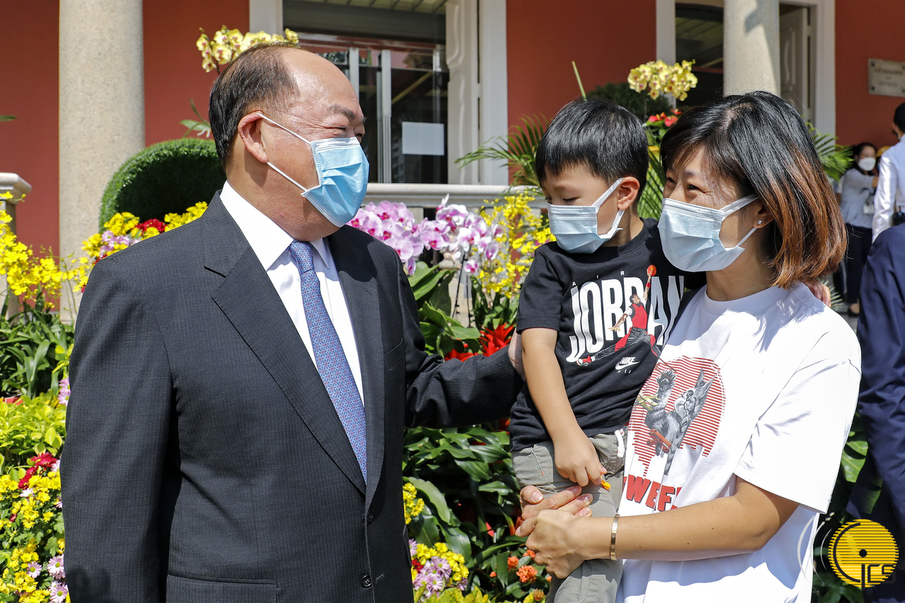 行政长官贺一诚在政府总部礼宾楼与到访的家庭合影留念