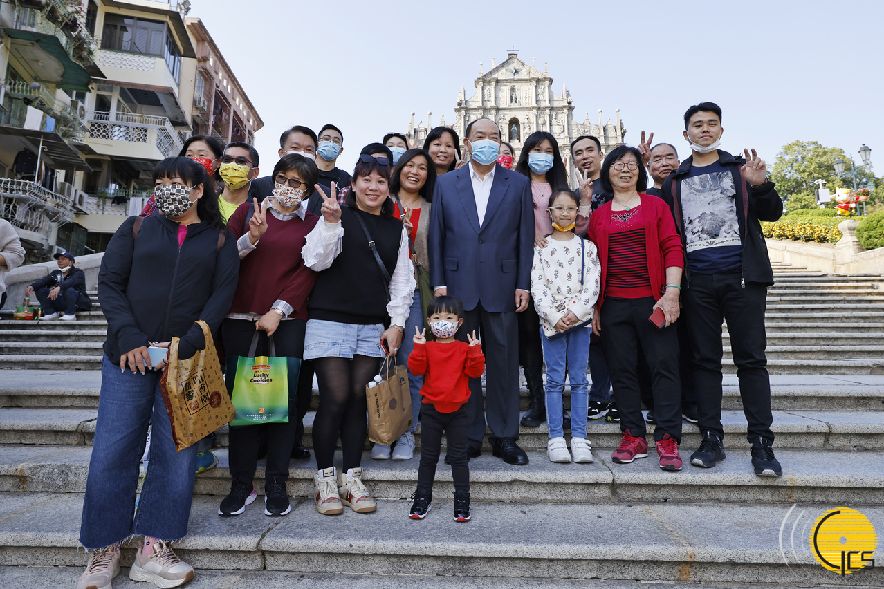 行政长官贺一诚走访大三巴街, 遇上热情的居民及游客一同合影。