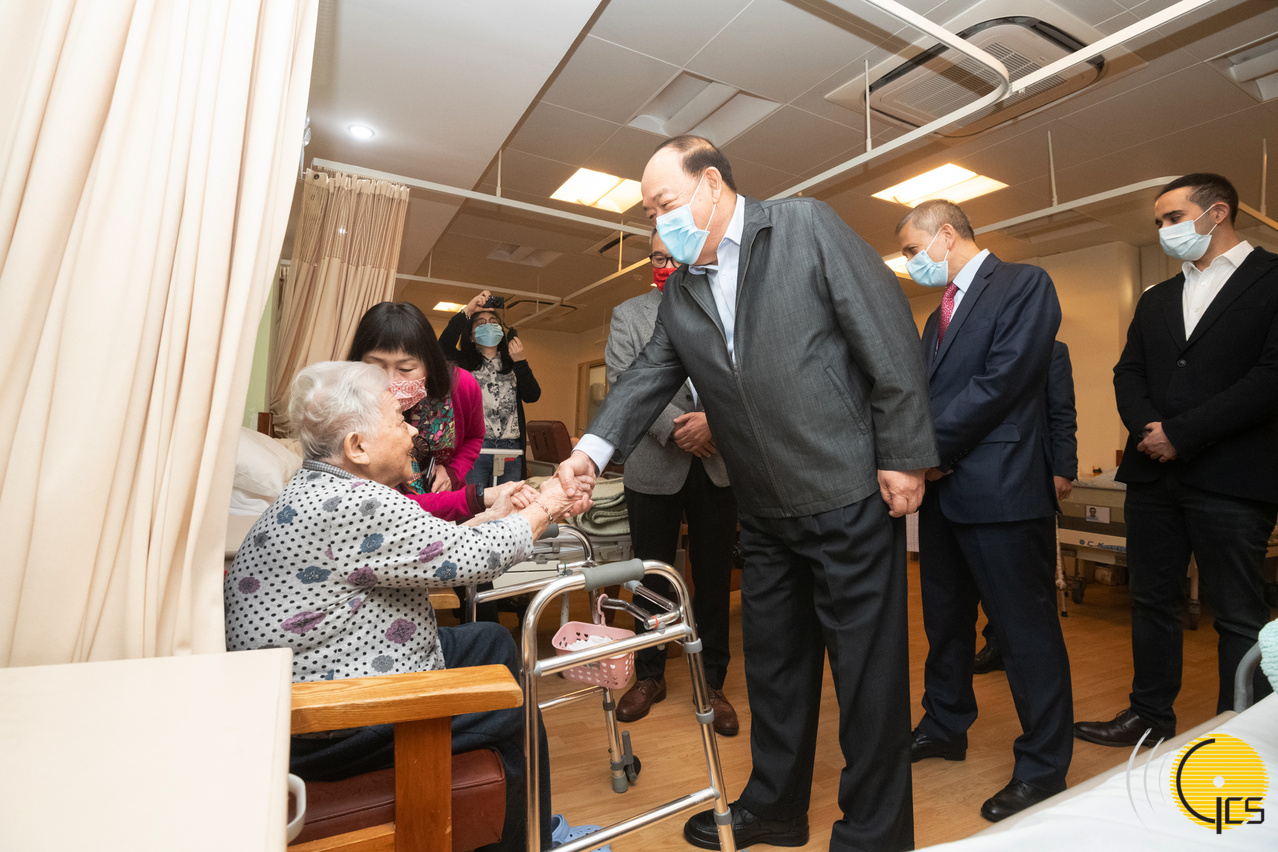 行政长官贺一诚探访安老院,与长者亲切握手,向长者送上节日的祝福。