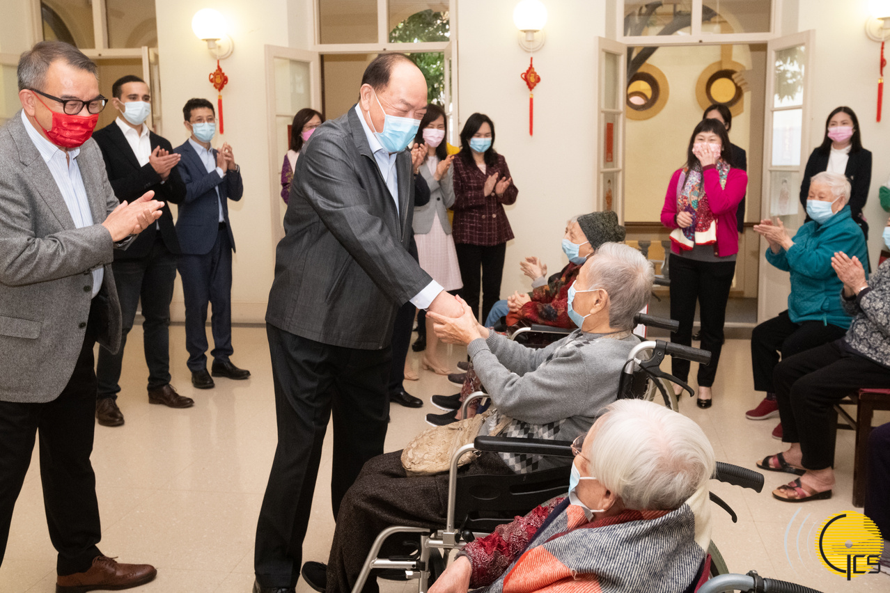 行政长官贺一诚探访安老院,与长者亲切握手,并向长者送上节日的祝福。