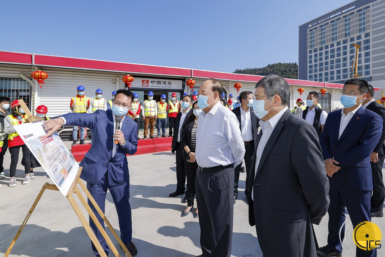 行政长官贺一诚巡视离岛医院工地写字楼,慰问驻留工人。