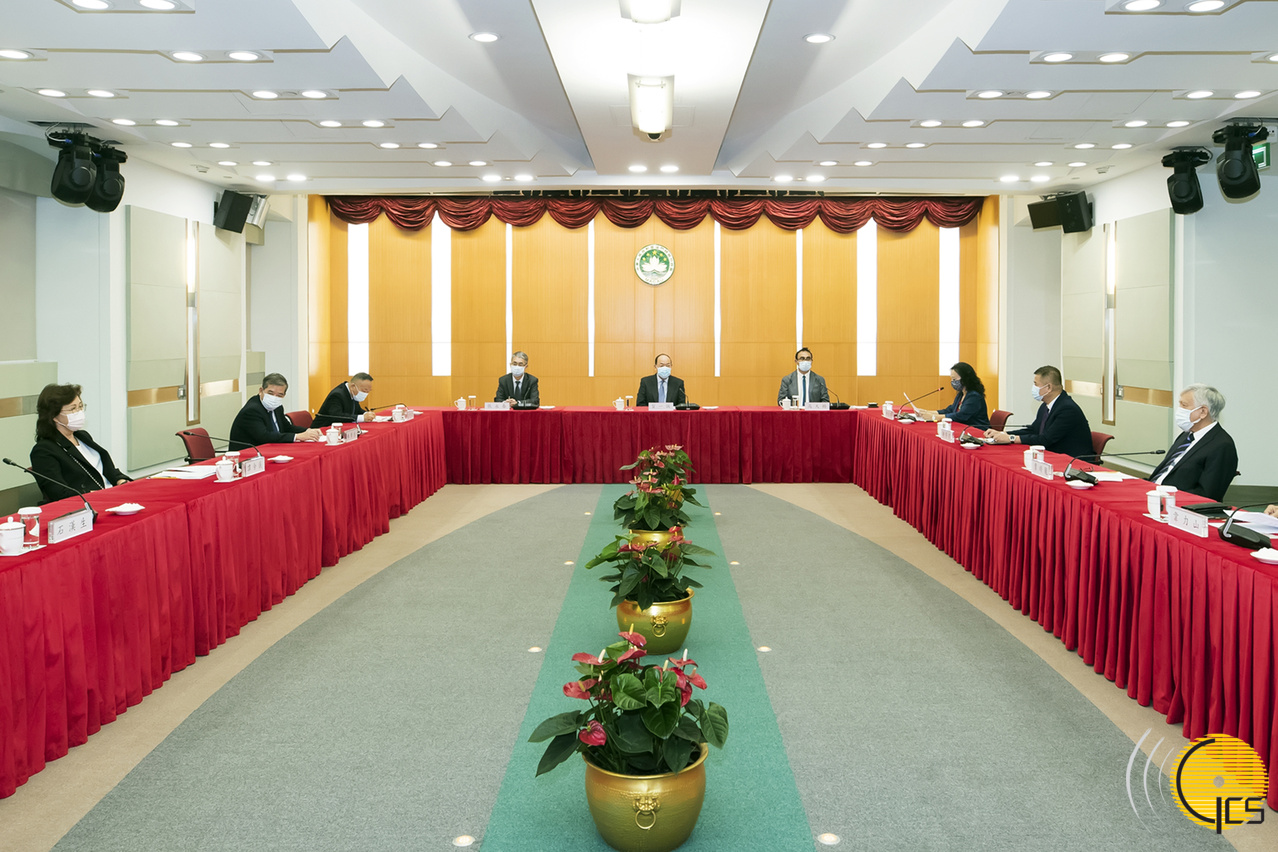 行政长官贺一诚会见澳门公职人员协会理事会主席高天赐一行,就制定2022年财政年度施政报告听取意见和建议。