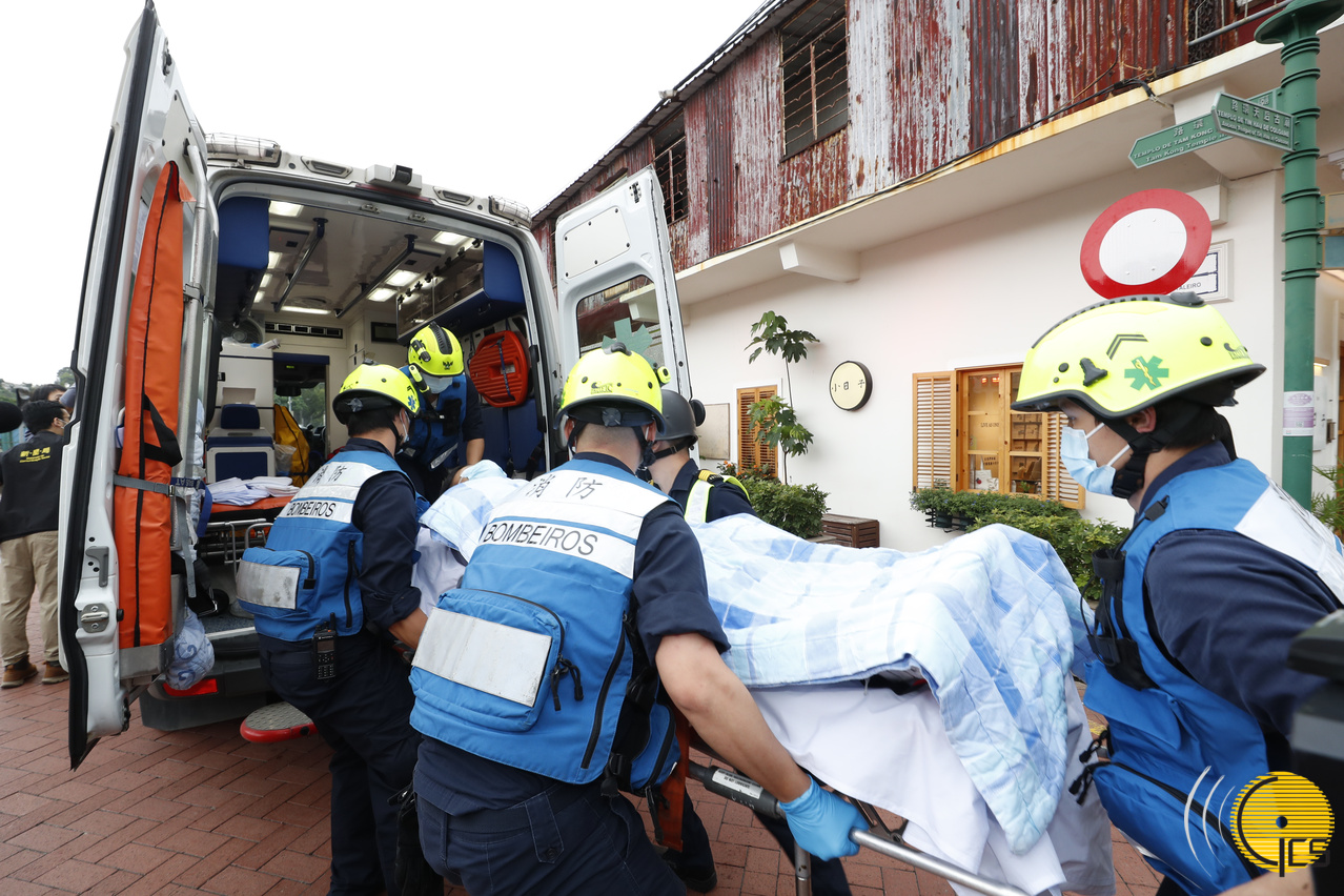 “水晶鱼2023”台风演习-保安部队高等学校人员协助因受伤而行动不便人士疏散撤离。