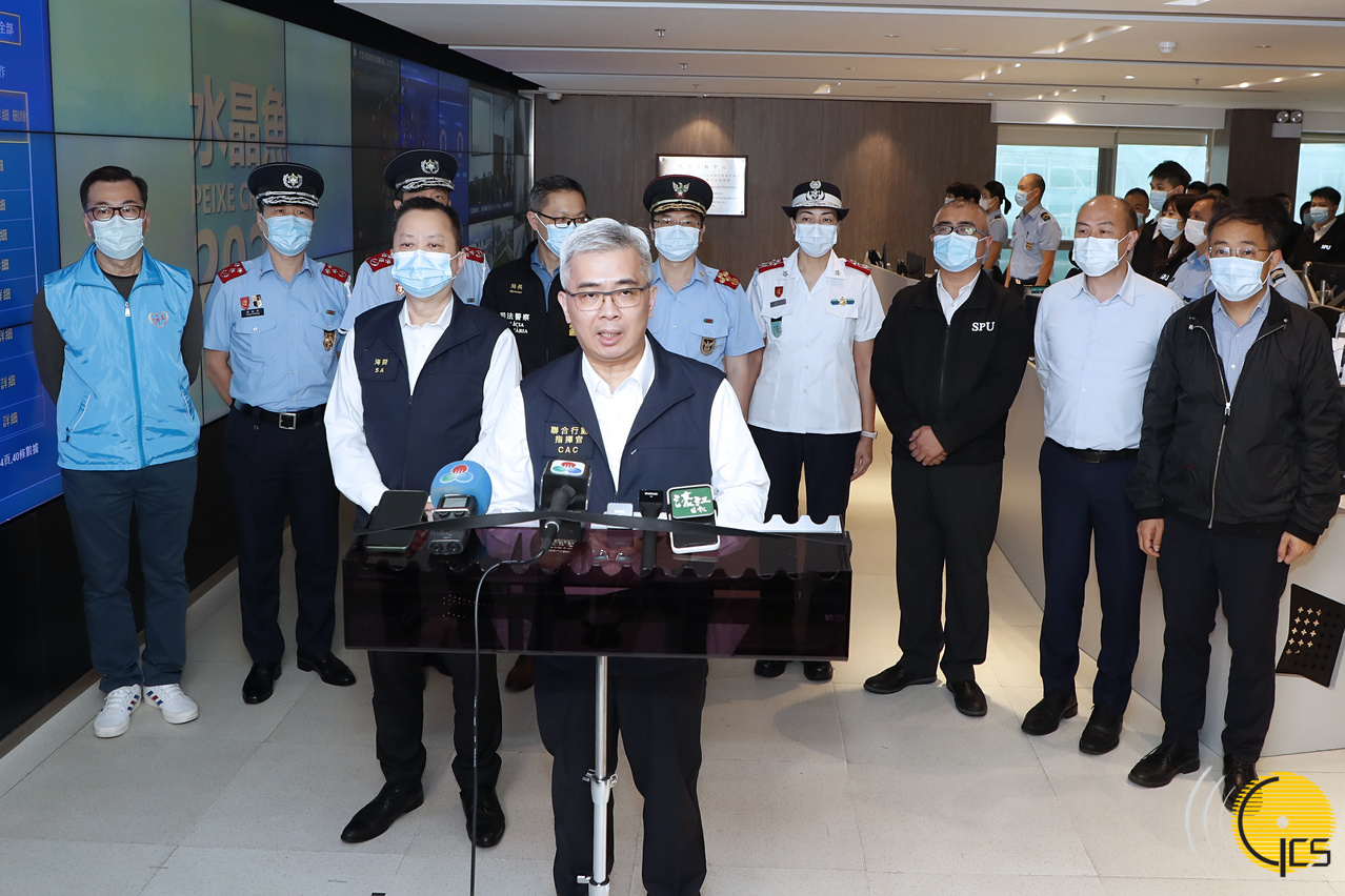 “水晶鱼2023”台风演习-保安司司长、联合行动指挥官黄少泽在民防行动中心向记者介绍演习详情。