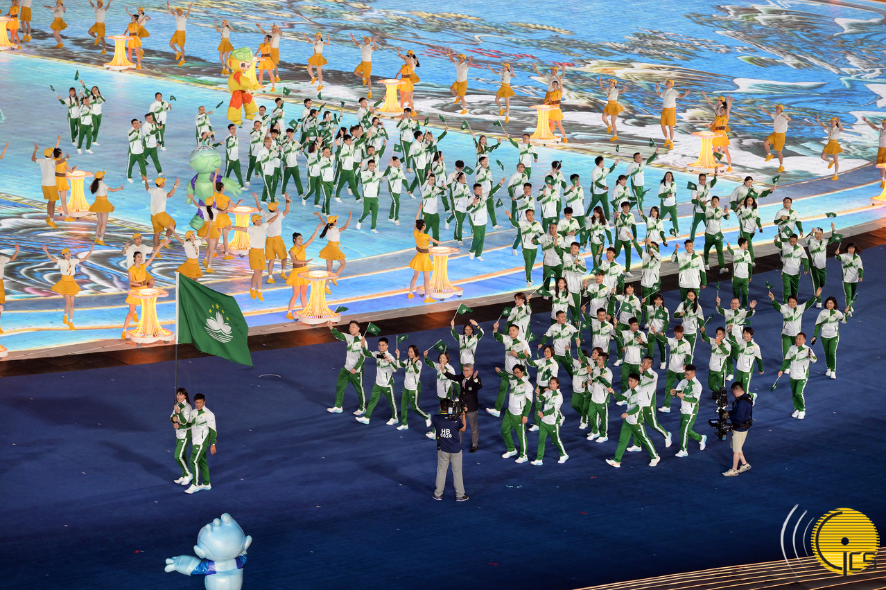 本澳派出273人的体育代表团参加杭州亚运21个比赛项目。代表团成员在开幕式上列队进场受到热烈欢迎。