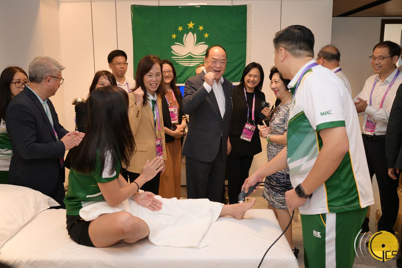 行政长官贺一诚祝贺夺得杭州亚运女子长拳金牌的本澳运动员李祎