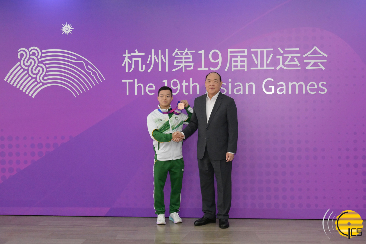 行政长官贺一诚祝贺日前为澳门特区夺得本届亚运首面奖牌的男子长拳铜牌得主宋子君