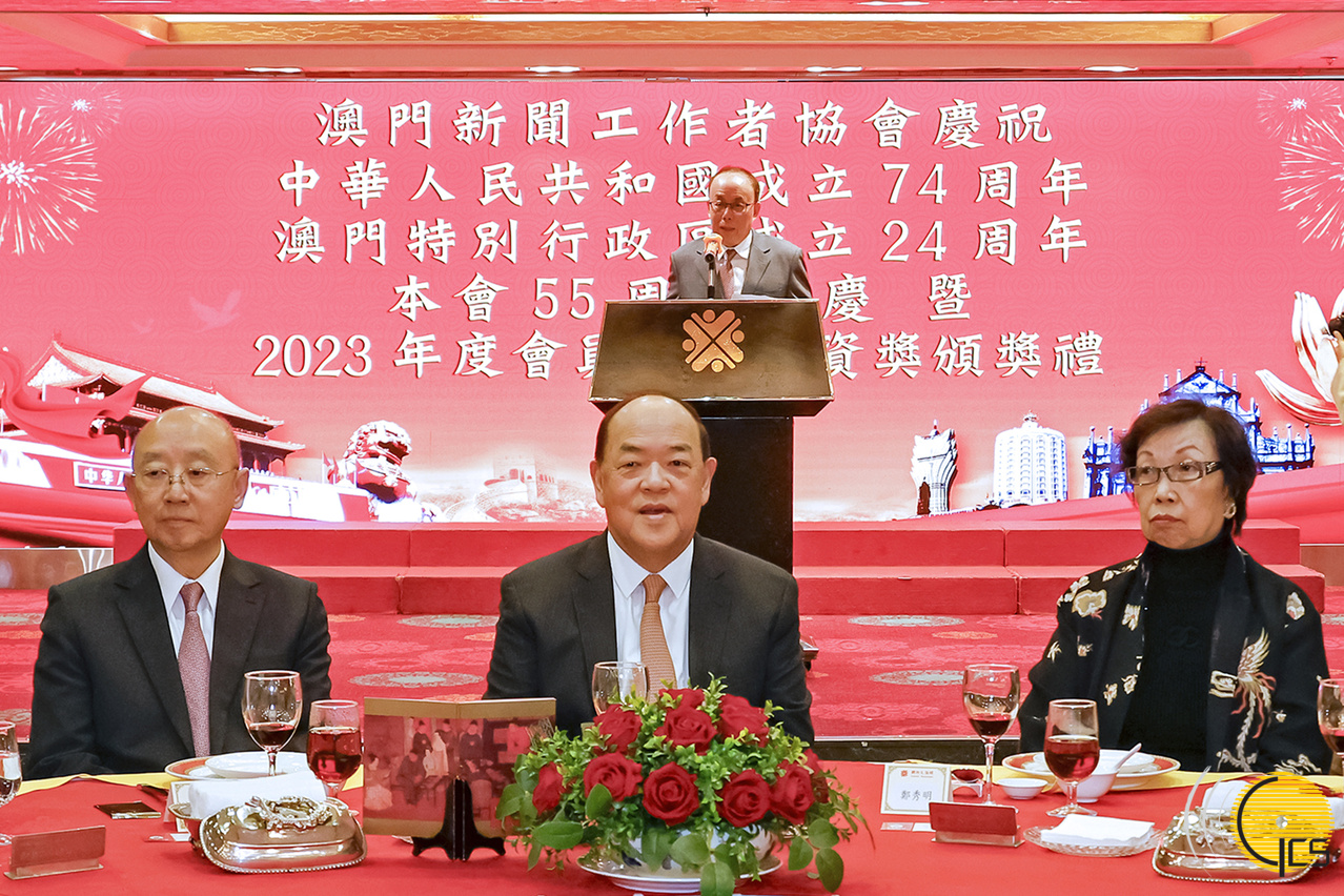 行政长官贺一诚出席澳门新闻工作者协会庆祝中华人民共和国成立74周年、澳门特别行政区成立24周年、协会55周年会庆暨2023年度会员服务年资颁奖礼。