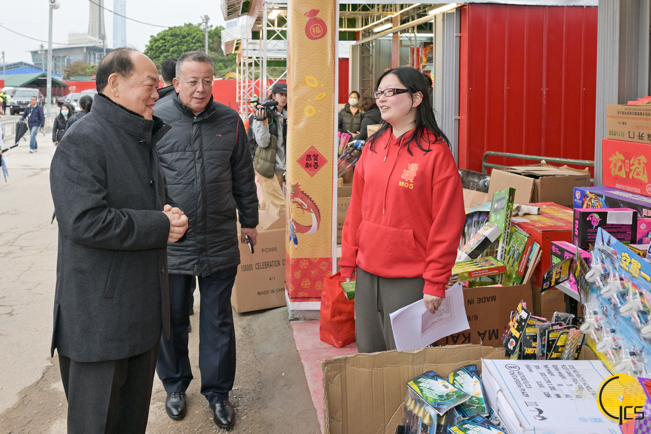 行政长官贺一诚与澳门区爆竹檔主亲切交谈,了解摊位入货情况。