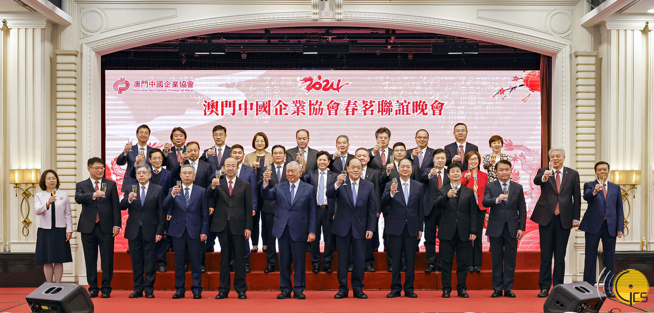 行政长官贺一诚与众嘉宾在澳门中国企业协会2024年春茗联谊晚会上祝酒