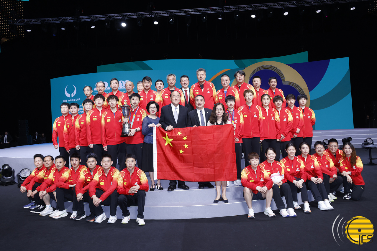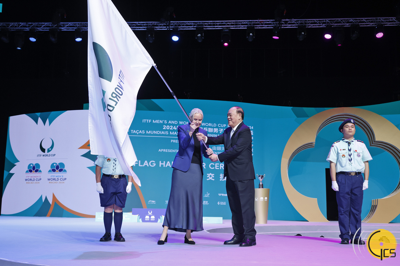 行政长官贺一诚交还2024年澳门国际乒联男子及女子世界杯会旗,由国际乒联主席 Petra Sorling 接受会旗。