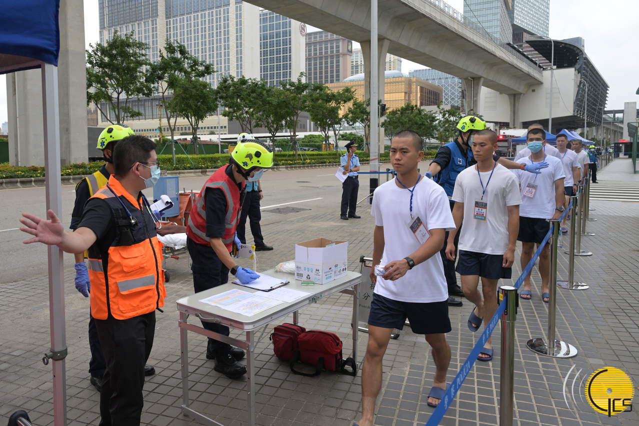 2024年大型联合反恐演练“盘龙” – 消防局及解放军驻澳部队人员对疏散观众进行检测及搜查。