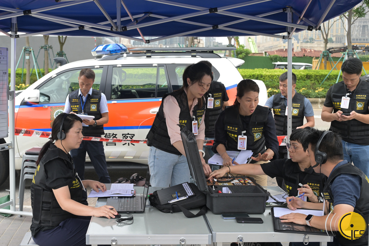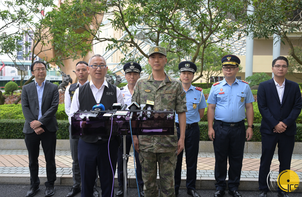 2024年大型联合反恐演练“盘龙" - 警察总局局长助理梁文照和中国人民解放军驻澳门部队副参谋长刘欢向传媒介绍演练流程及相关安排。