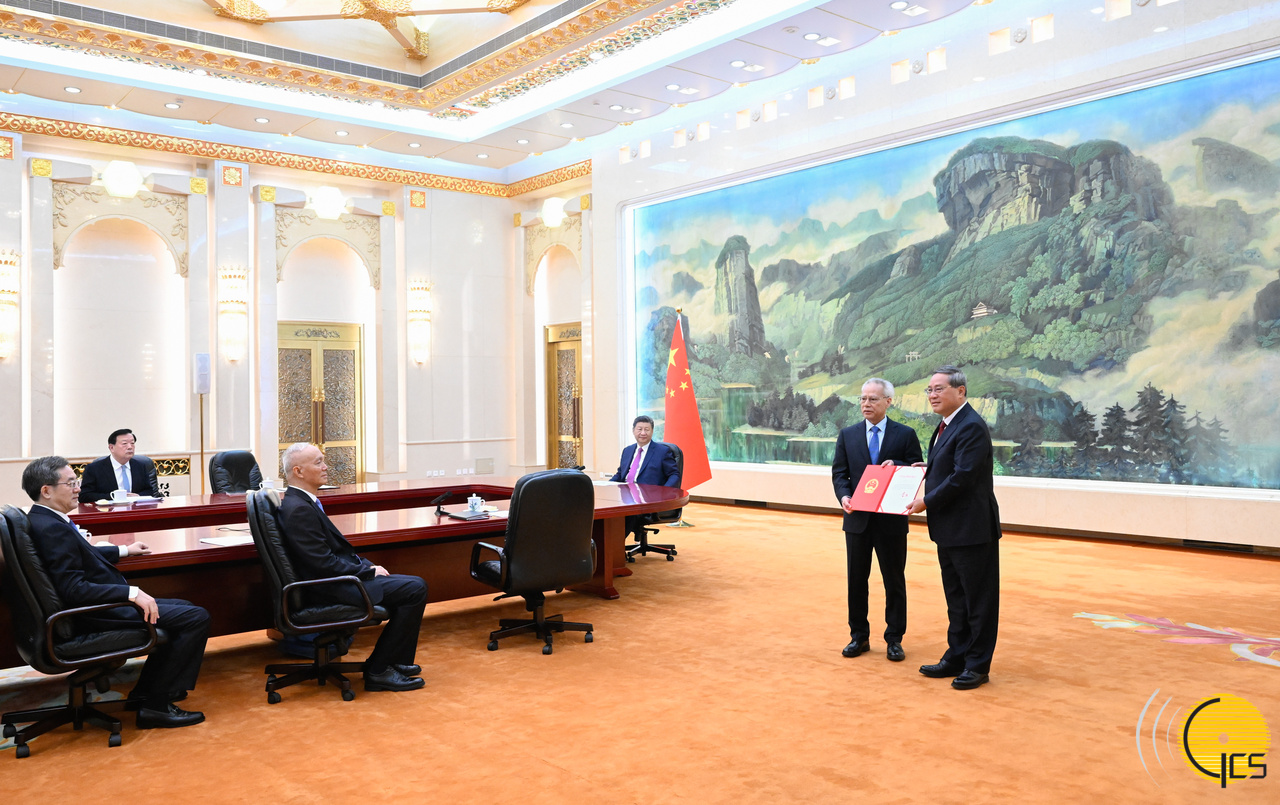 国家主席习近平在北京人民大会堂会见新当选并获中央政府任命的澳门特别行政区第六任行政长官岑浩辉。这是在习近平的见证下,国务院总理李强向岑浩辉颁发任命他为中华人民共和国澳门特别行政区第六任行政长官的国务院第794号令。(新华社图片)