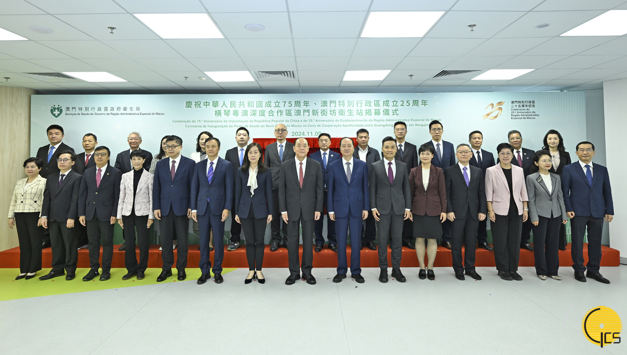 行政长官贺一诚与出席横琴粤澳深度合作区澳门新街坊卫生站揭幕仪式的嘉宾合影