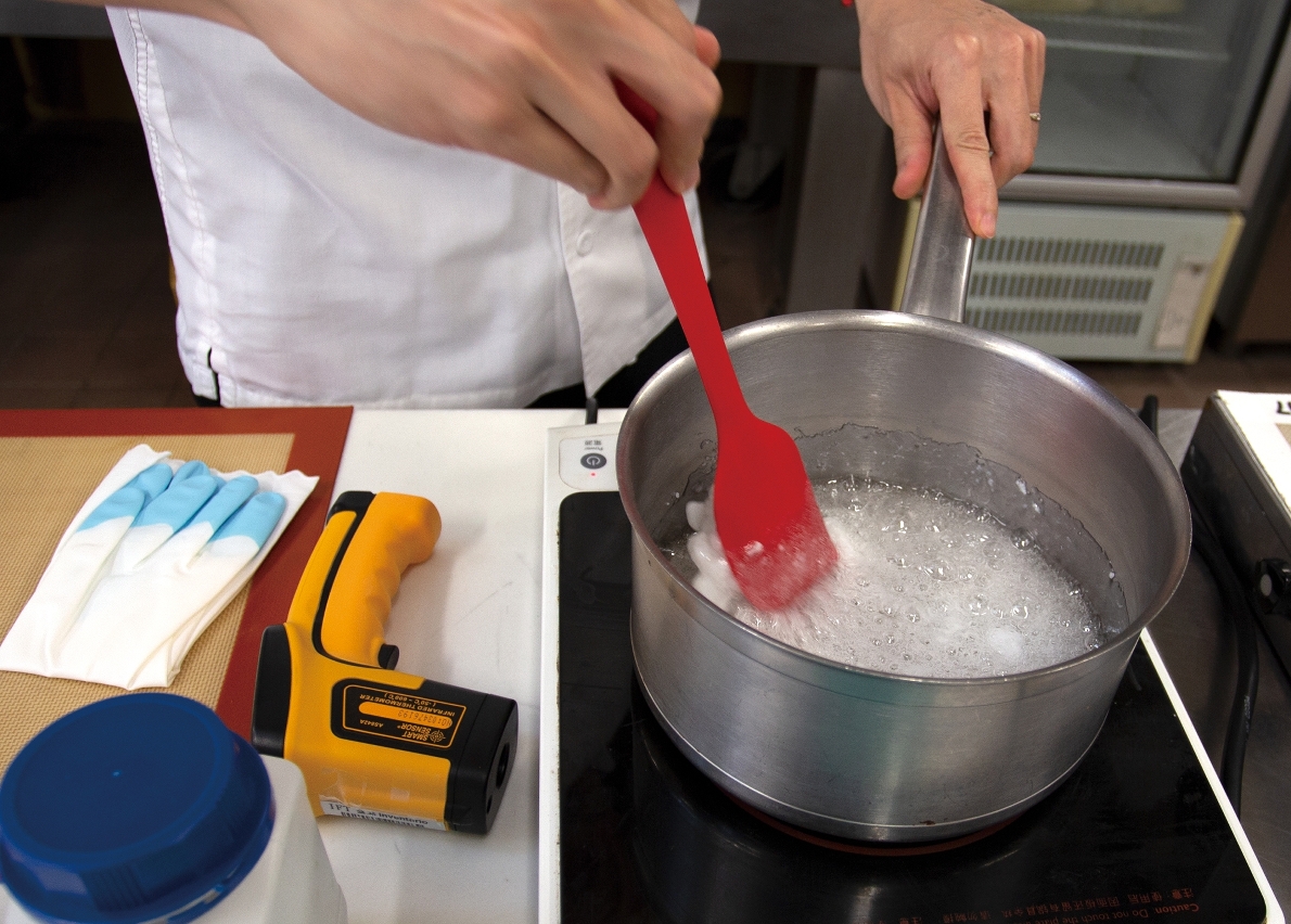 制作拉糖雕塑,除了技巧,由选料开始的每一步都非常重要。刘择祥介绍,制作雕塑的糖,除了以普通砂糖加入辅佐材料外,亦可直接使用较为方便的艺术糖(人造糖,又称珍珠糖)。处理糖时,首先将糖加热融化,并把温度控制在165至170℃,避免温度过高令糖身偏硬,或过低令糖身过软。然后,可根据需要把糖抛光。抛光后的糖身会变得更为通透及富有光泽,能为作品带来不一样的效果。制作时,要不断把糖身拉长、折迭、搓、捏等,让空气混入其中。由于抛光后的糖身颜色会变浅,煮糖时须注意及调整色素用量。