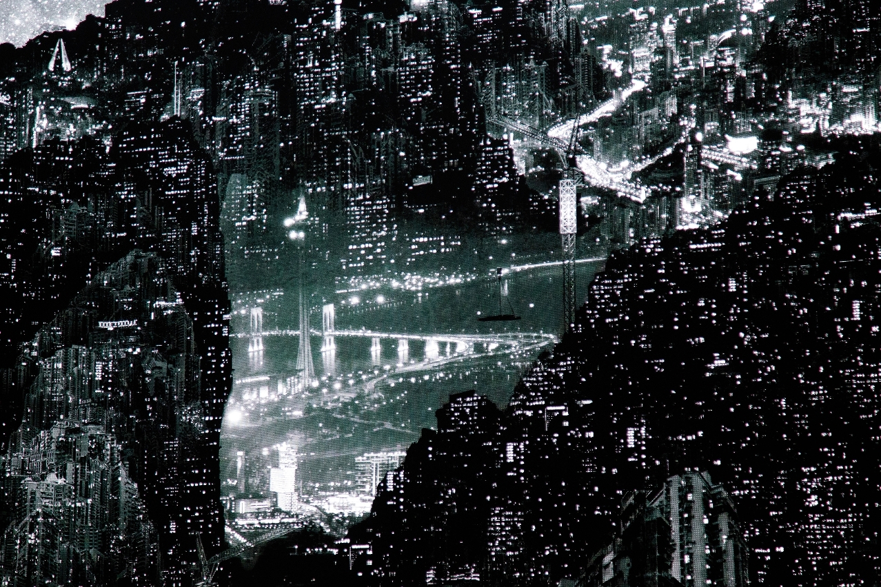在《夜游记二》中,杨泳梁在纵横交错的山间,放满了高楼大厦的影像,他希望透过作品让观众反思:「城市发展无疑推动着社会经济,但过度的城市化,是否真的好?」