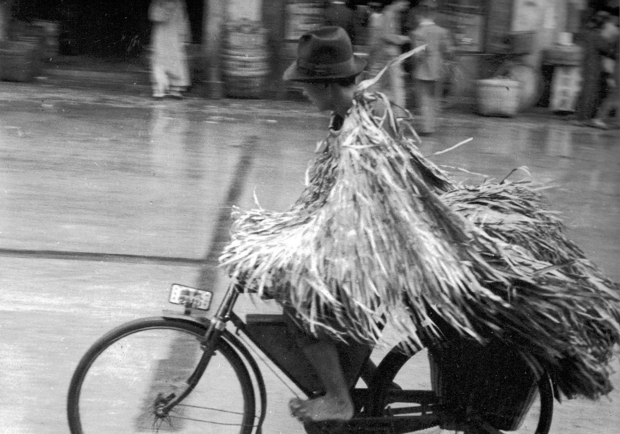 历史久远的旧式雨衣,多以蓑草(龙须草)或棕绳一针一线编织成,配以蓑笠或竹笠用作挡雨。户外劳动者和渔民在雨天穿蓑衣戴蓑笠,可腾出双手干活。1960年代后被塑料雨衣取代。图为50年代前澳门街头一名穿着蓑衣骑单车的男子。