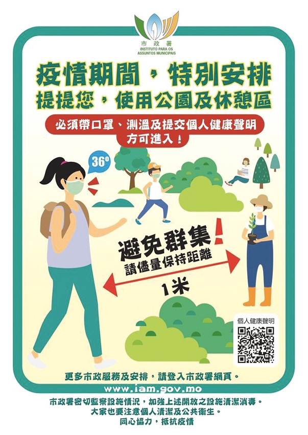 随着澳门疫情渐趋缓和,市政署辖下公园及休憩区等部份户外设施,由2月20日起有限度开放,并按卫生局的指引进行管理。冯惠星指出,大部份市民进入绿化设施时,均配合接受探测体温,亦会做好自身防护,但有少数市民未有佩戴口罩,甚至出现乱抛使用过的口罩和随地吐痰等现象。为了避免病毒散播和减少清洁人员工作量,市政署透过公众场所的显示屏和广播系统播放防疫资讯,亦派员巡查,对违例者进行劝喻,必要时提出检控。