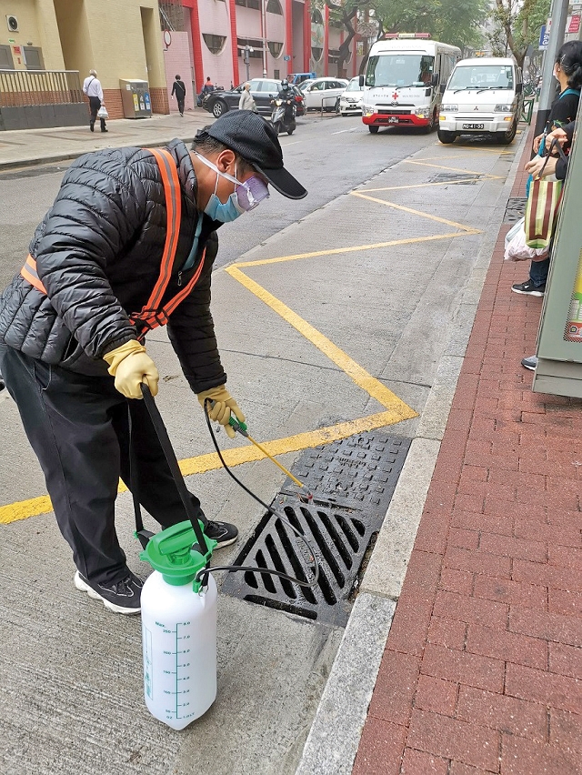 为配合政府整体的防疫抗疫工作,从源头减低病毒在社区传播的风险,市政署环境卫生及执照厅厅长冯惠星介绍,署方在行人天桥、公厕和出入境口岸等公共区域,都安排了清洁人员加强清洁及消毒,并协调外判服务公司以专用的喷雾器和水车,定时对渠口和公共街道喷洒稀释漂白水,进一步提高社区清洁的全面性。