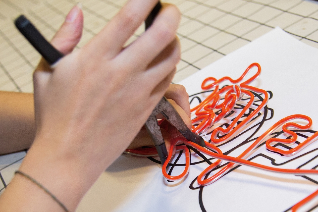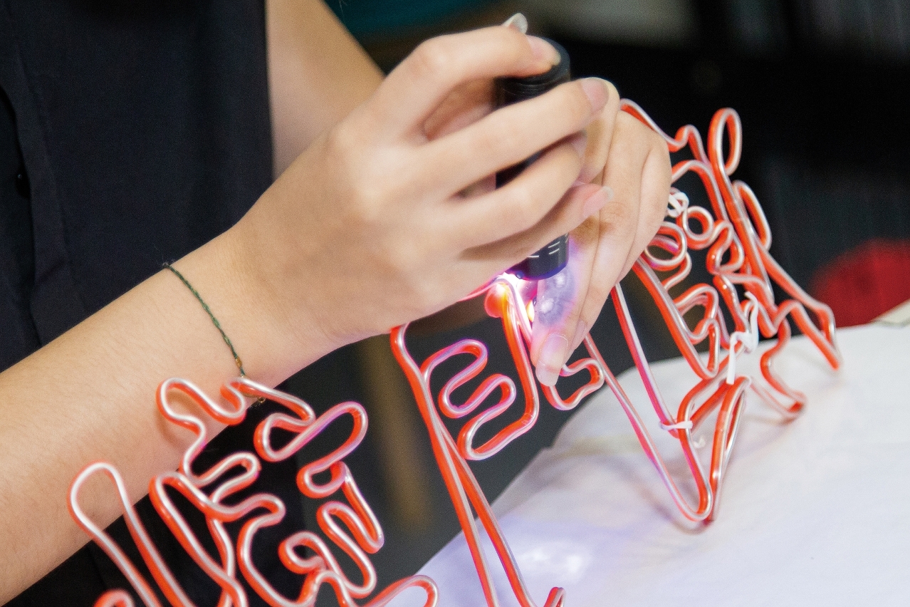相比起制作传统霓虹招牌要加热弯曲玻璃管、连接电极,再清除玻璃管内杂质、排出空气并添加气体等等专业工序,冷光灯牌的制法门槛较低,但Ruby指出,要把成品做得好看,仍须花上不少心思:“在制作灯牌前,需要先打印设计图,再用线照着图纸绕出造型,较为特别的是,冷光灯牌须‘一气呵成’,即用一条线完成整个图案或字样。因此,在整个制作过程中,要不断思考如何用线把分离部份自然地串连起来,这十分考验制作者的动手能力、美感、排线布局的技巧。”除了绕线,冷光灯还须经铁线固定、UV胶黏合等程序,完成一个尺寸约为30厘米的招牌,往往需要2至3小时。虽然耗时良久,但带着满满心意制作出来的手作品,比起量产商品,更多添一份温暖。她说:“参加课程的学员,涵盖不同年龄和性别,是一项任何人士都能参与的手作活动。”