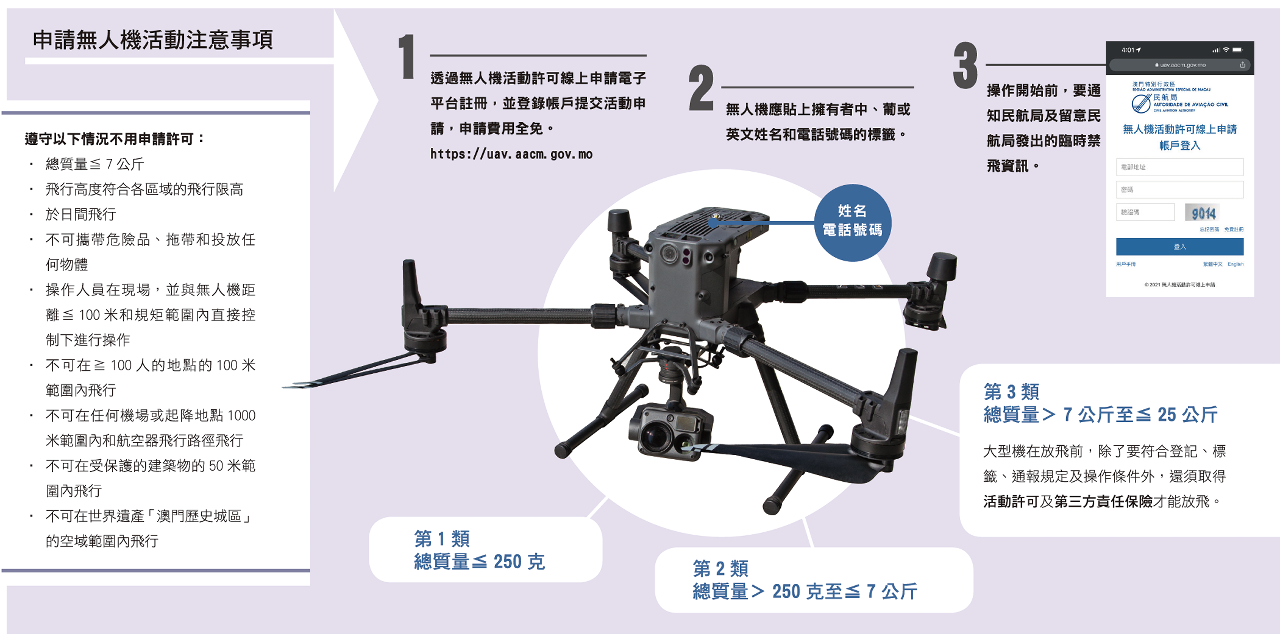 经修订的《澳门空中航行规章》现已生效,使用者如要在澳门放飞无人机,必须遵守相关规定。民航局航空标准暨执照部安全主任(航空标准)黄永基称,现时局方把无人机分成三种,分别是重量为250克或以下的小型机、大于250克至7公斤内的中型机,以及大于7公斤至25公斤内的大型机。因应不同重量机种存在的安全风险,局方针对放飞前的通知、机身上的标签、无人机及无人机操作员的登记、操作员最低年龄要求、禁止在世界遗产「澳门历史城区」的空域飞行等方面设置了一定限制。同时,本次修例也放宽了以往无人机不能在离地面以上30米飞行的高度约束,现时特定区域的飞行限高已提升至50米至250米。