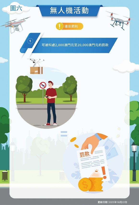 为了加强宣传推广,民航局制作了相关法规的图文包,让市民大众可一目了然地掌握规章内容,同时也在口岸及相关地点播放宣传影片,以提高市民和旅客对澳门无人机活动的安全认知。未来,民航局有计划与澳门无人机组织、团体合办工作坊,详细介绍规章内容、线上平台操作及申请要点。