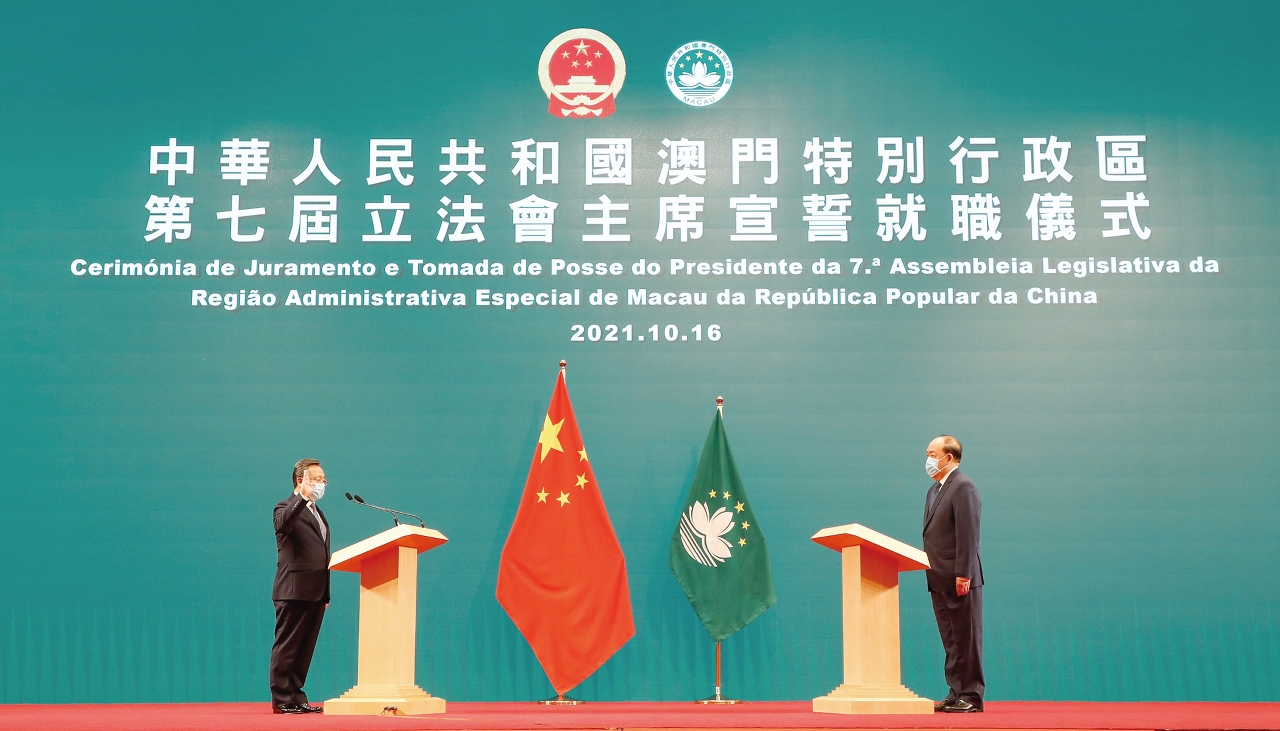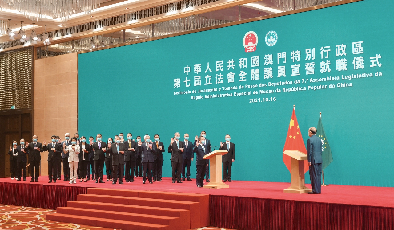 新一届立法会议员就职仪式假中国与葡语国家商贸合作服务平台综合体举行,由行政长官贺一诚监誓。全体议员郑重宣誓,承诺拥护并执行《澳门特别行政区基本法》,效忠中华人民共和国澳门特别行政区,尽忠职守,遵守法律,廉洁奉公,竭诚为澳门特区服务。