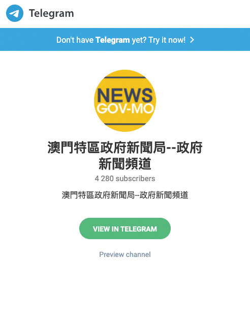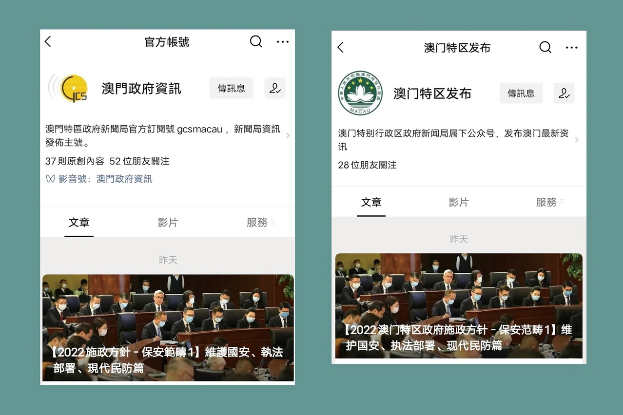 新闻局有系统地在新媒体平台发放讯息,始于2015年起,局方先后开设了微信公众号、Facebook帐号,之后相继加入微博、今日头条号、YouTube等新媒体平台,以不同的形式发放特区政府的权威讯息。2020年2月,为方便海外澳门市民接收特区防疫讯息,还推出了Telegram政府新闻频道。今年2月,开通微信影音号,让特区讯息更快更准地传送到世界不同角落。