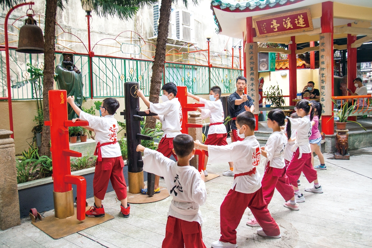 「噔、噔噔、噔」一下下铿锵有力、肉体与木桩的踫撞声,响彻于新桥花园内。寻声望去,身穿整齐功夫衫的学徒,正依从师傅的指导,对着鲜红色的木人桩,施展刚劲的套路,在方寸之地,拳脚之间,显现尚武精神。这,就是「红船木人桩」!