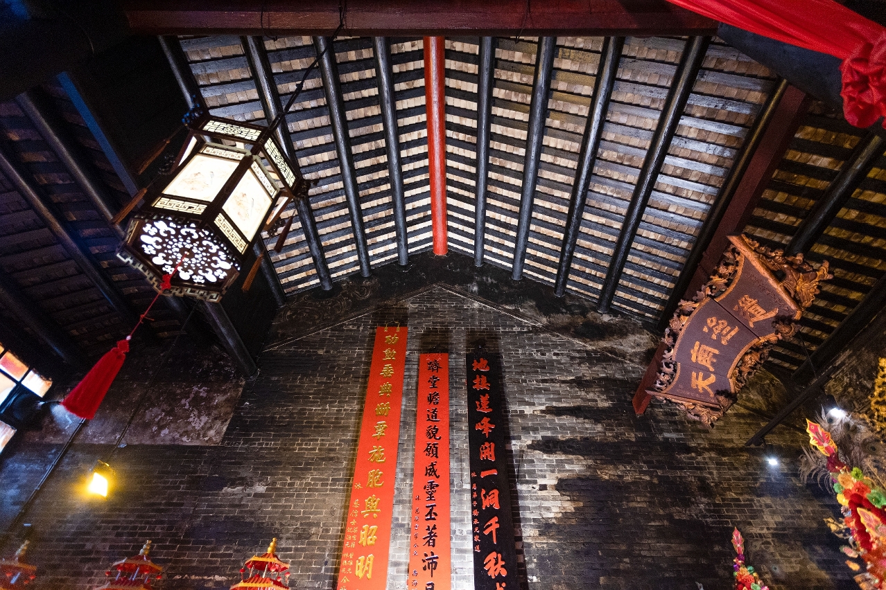 门堂中央设有高大木门,其后设有屏门与庭院分隔,在主殿正前方,建有四方拜亭,庭院两侧建有廊道。两侧偏厅亦有小庭院(天井)将前后分隔。主殿为三开间,由两组抬梁式梁架支承屋顶。