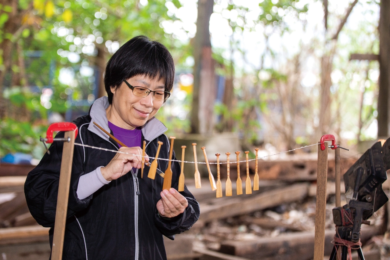 「很多人跟我说,澳门人现在已不会造船。」与刨冰一样是「龙舟发烧友」的另一位学生、有30年划龙舟经验的李洇斈(外号「斈神」),因参与路环深度游导赏团而认识了协会,也对造船产生了兴趣。不同于刨冰的内敛,活泼的斈神到处询问有关造船工作坊的资料和参加的途径。对于这次能够参与制作龙舟模型,她回想起来仍十分兴奋。