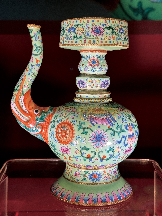 奔巴壶上的「摩竭鱼」,是一种源于印度神话中的神兽形象。「奔巴」是藏语「瓶」的音译,多作为宗教法器使用,象征祥瑞如意。奔巴壶是清宫的佛堂供器,也是皇帝赏赐给西藏、青海及蒙古地区宗教领袖及佛教寺院的赏品,也作为陵寝的陈设供器。