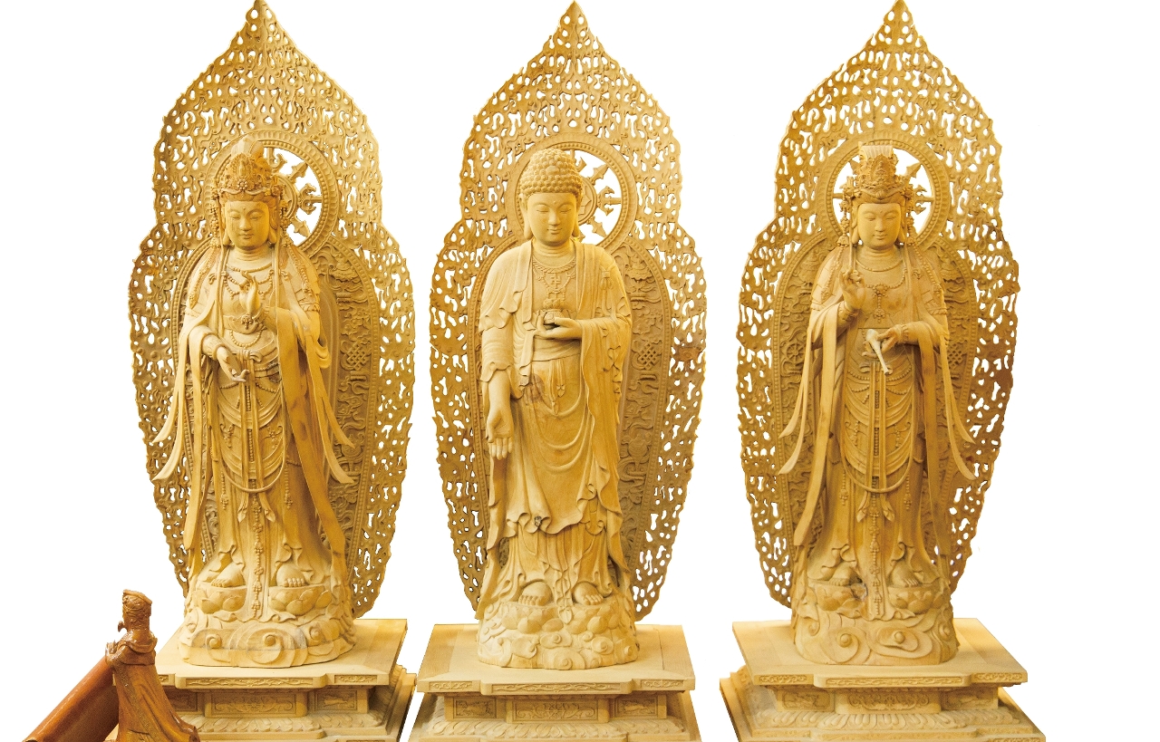 部份佛像完成后,仍要配上佛座、「背光」。佛座又称「莲花座」,传承做法上,佛座分为「单缩腰莲花座」和「双缩腰莲花座」,佛像的高度和莲花座的高度需一致。「背光」则是佛像头部背后的配件,代表着圣人的光环,比例上倘若佛身约一尺高,佛像的总高度连「背光」需是三尺,是为一般庙宇的做法。