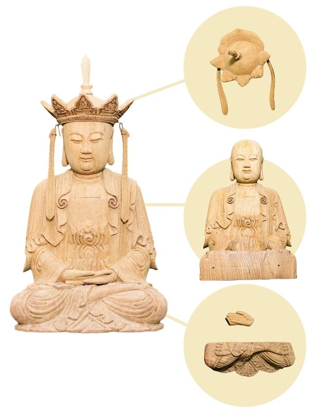 曾德衡指出,神像雕刻除了采用传统的「整木雕刻法」制作,在特定情况下也会采用宁波技术「接木法」。他遂拿出佛像拆件讲解:「有些名贵木材,由于体积不是很大,师傅在雕刻前,把整块木头除皮除芯,最后所剩的部份已不多,便需要逐块拼接。浙江宁波漆器打磨、雕刻远近驰名,买家也多为达官贵人。『接木法』有着严格的技术要求,尤其是在打磨和接驳过程,难以保证木不会收缩;此外,木头是纤维组织,内有木芯容易吸取湿汽,所以需要钻孔,也要讲求每个组件之间纹理相符。因工序繁琐,故此成本也较高。」