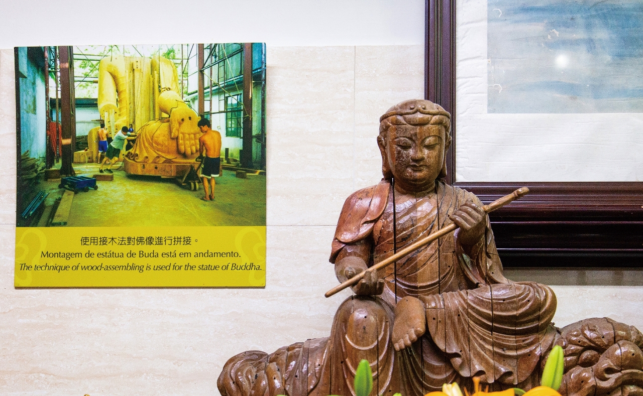「大昌佛像雕刻木器」对于宗教雕像的摸索和钻研,也推动澳门神像雕刻的技艺更为精湛,皆因各类雕刻之中,对宗教雕像的要求格外高,从设计、选材、雕刻、拼接、打磨、做底、贴金箔和上彩等步骤,每个环节都需要师傅精雕细琢。此外,佛像三庭讲求饱满圆润,入定讲求整体神韵,打坐姿势讲求拔背含胸,其精妙在于整体呈现出「慈悲庄严」的感觉,也考验着师傅的本领。「木头虽是死物,但宗教雕像可让人心灵平静,大的雕像更容易产生震慑感觉,令人油然而生敬畏之心。」